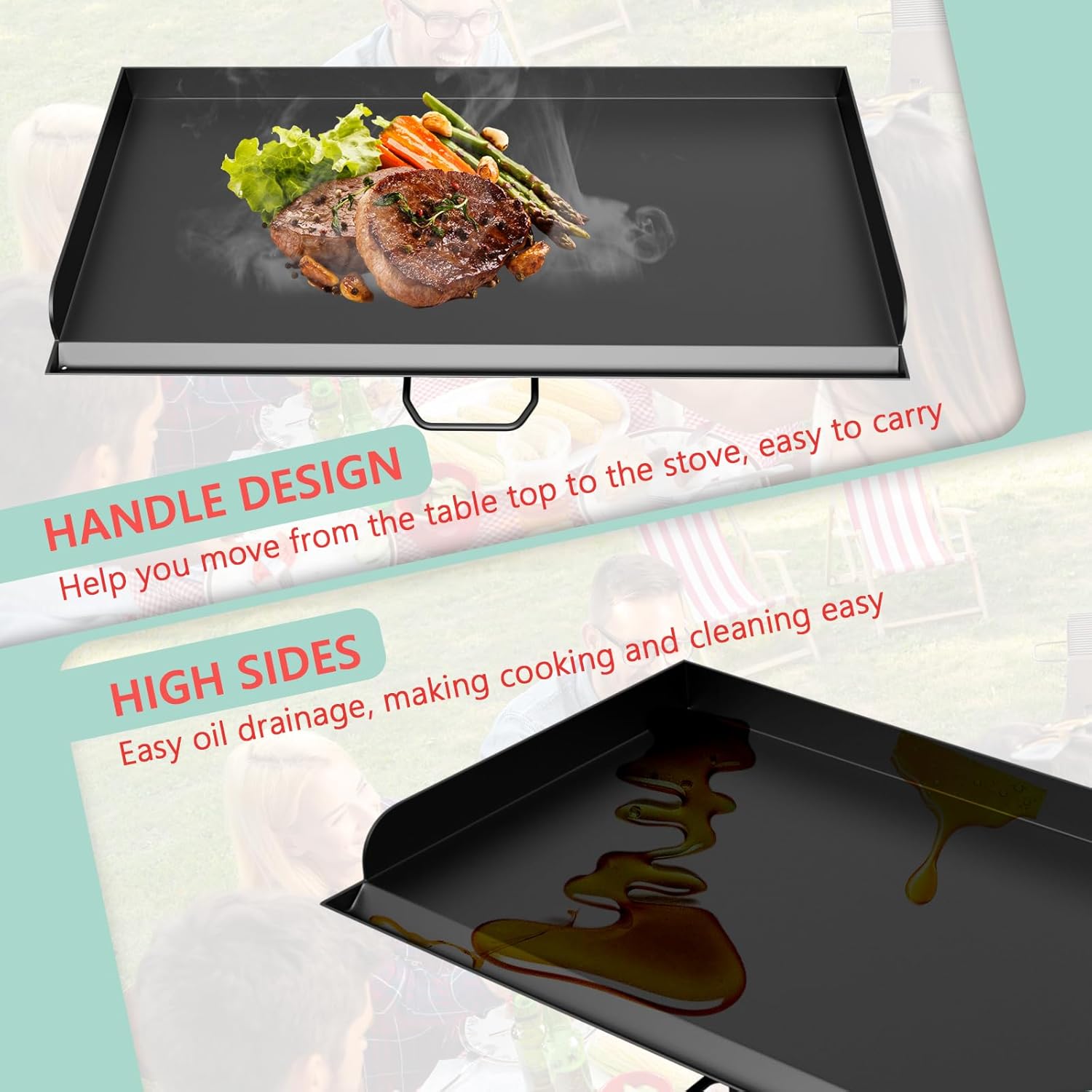 - Handle Design: Our universal flat-top frying pan with handle design can help you move from the table top to the stove, easy to carry and transport, at the same time, our surface has grooves to help you better collect and drain grease, more convenient design, save you time and effort, better enjoy your barbecue feast, whether you are camping outdoors, RV or family dinner, It is the ideal frying pan for cooking