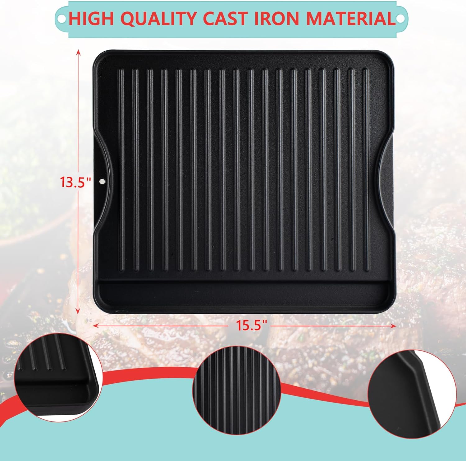 - What you get: 1 pack of griddle pan,Made of high quality cast iron,Dimensions: 15.5"L x 13.5"W, Please check the size you need before ordering! (Tip: After cleaning, please dry the skillet immediately with a towel or cloth, and then coat the surface of the skillet with cooking oil to prevent it from rusting)