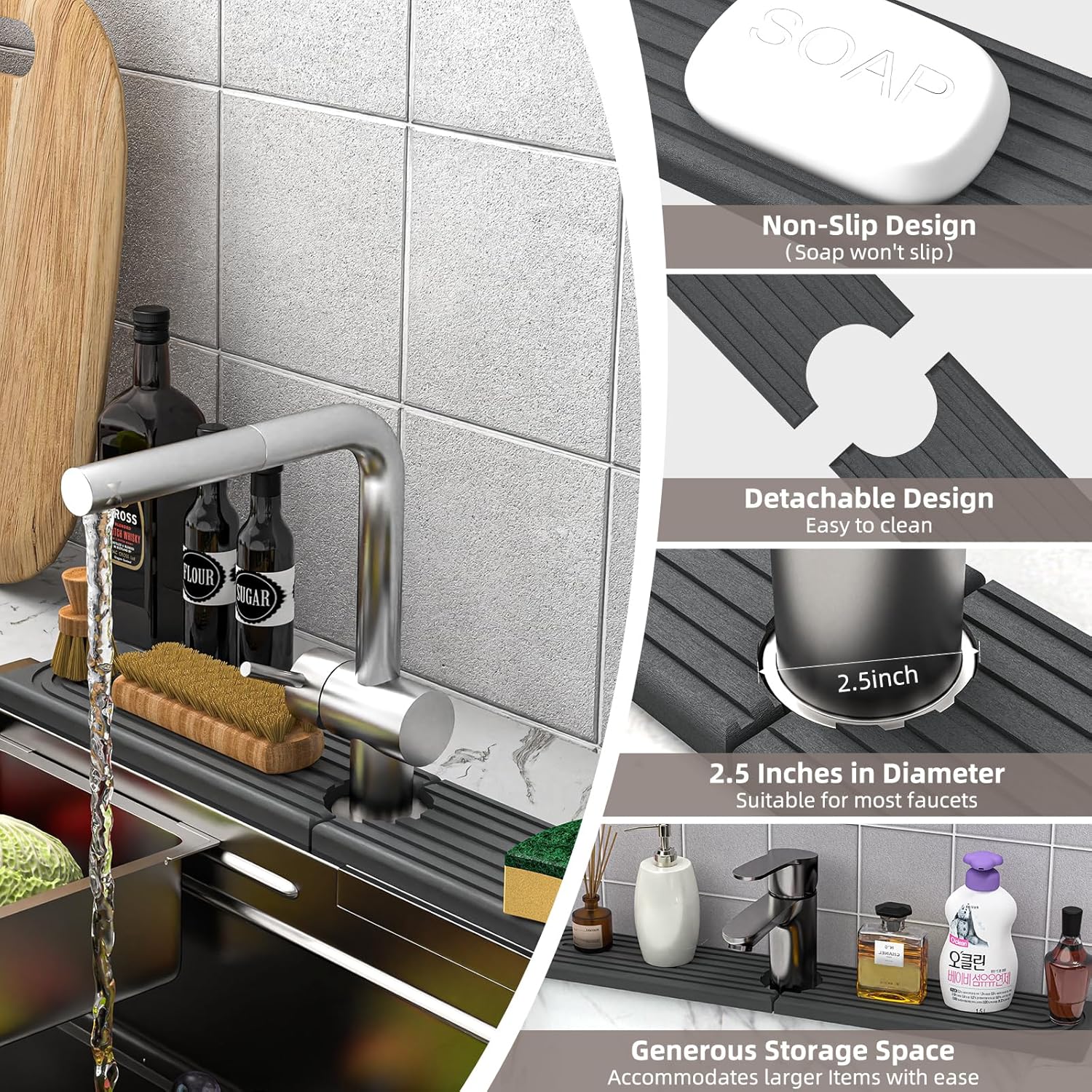 - 【Sink Pad and Storage Box】 This pad not only absorbs the moisture around the faucet, but also can hold soap, toothbrushes, cups, and other items that need to be dried. Thus, you can say goodbye to stains on the sink and keep the countertop clean and dry. Please clean the dishwashing sponge thoroughly and place it on the sink pad