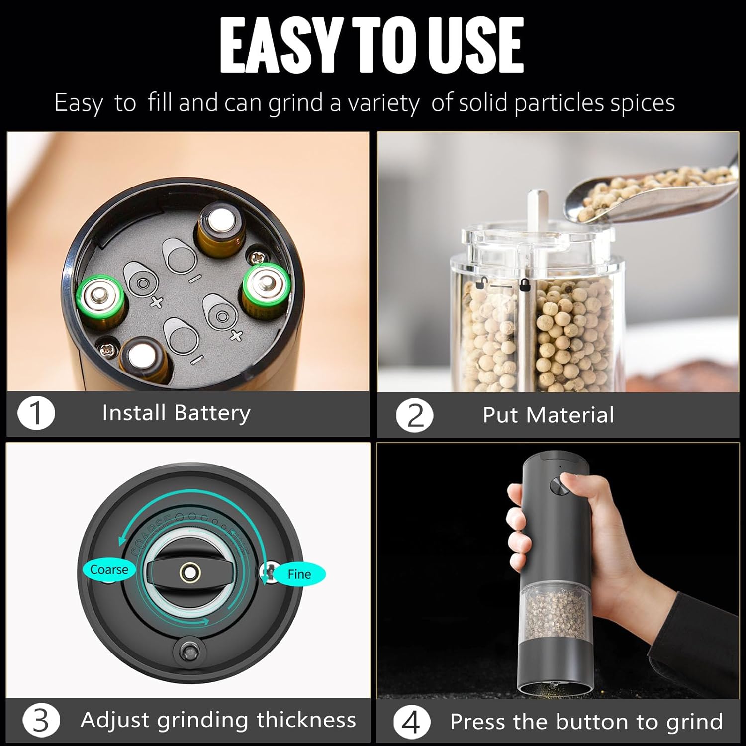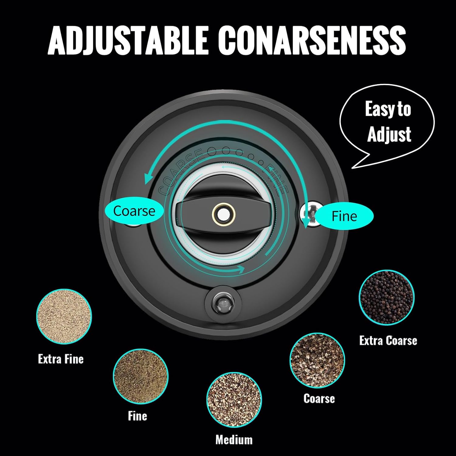 - ADJUSTABLE COARSENESS: This electric salt mill and pepper grinder allows you to choose between fine powder and coarse grinding. you can enjoy wonderful and precise taste experiences by adjusting the thickness.