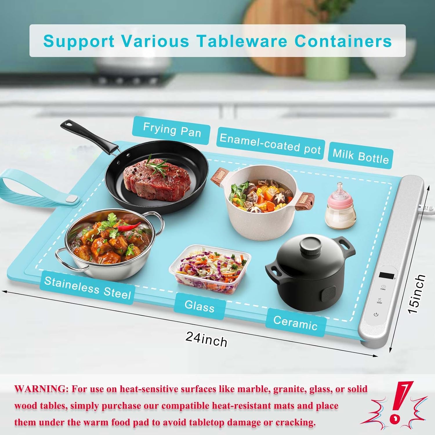 - [PLEASE NOTE]: For using our warming mat on stone or quartz surfaces, it's important to note that these surfaces are heat-sensitive. To avoid damage to your tabletop, either place an insulated mat beneath the product or preheat the surface with a hot towel first. And remember to start with the lowest temperature setting and then gradually increase it as needed. The heat-insulating pad can be purchased together in the product bundle list