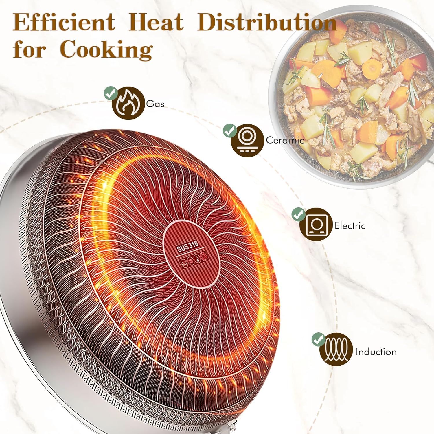 - ăNo chemical coating, Healthy cooking-Technology for Superior CookingăOur skillet features advanced tri-ply construction, combining aluminum sandwiched between two layers of high-quality stainless steel. This innovative design enhances conductivity for even heating while providing the durability and searing power of stainless steel