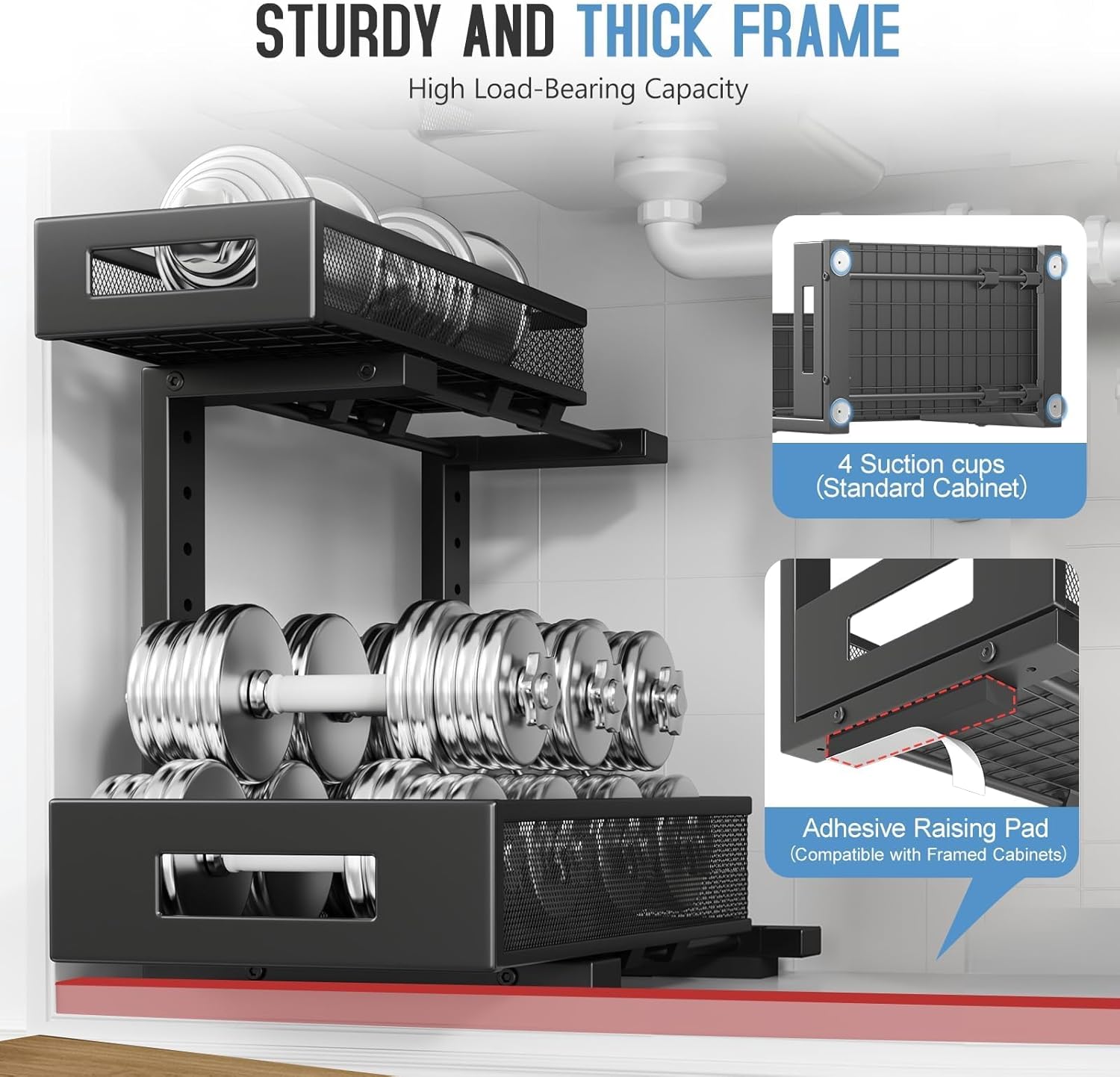 - ă2-Tier Pull-Out Design for Easy AccessăThis under-sink organizer features a double-layer pull-out design, allowing you to easily access items at the deepest part. The upgraded, thickened iron circular sliding rails ensure a smooth and seamless pulling experience, making each use effortless. The unique pull-out locking mechanism effectively prevents the drawers from being completely pulled out, avoiding the risk of items falling or structural damage caused by over-pulling, ensuring safer and more convenient use.