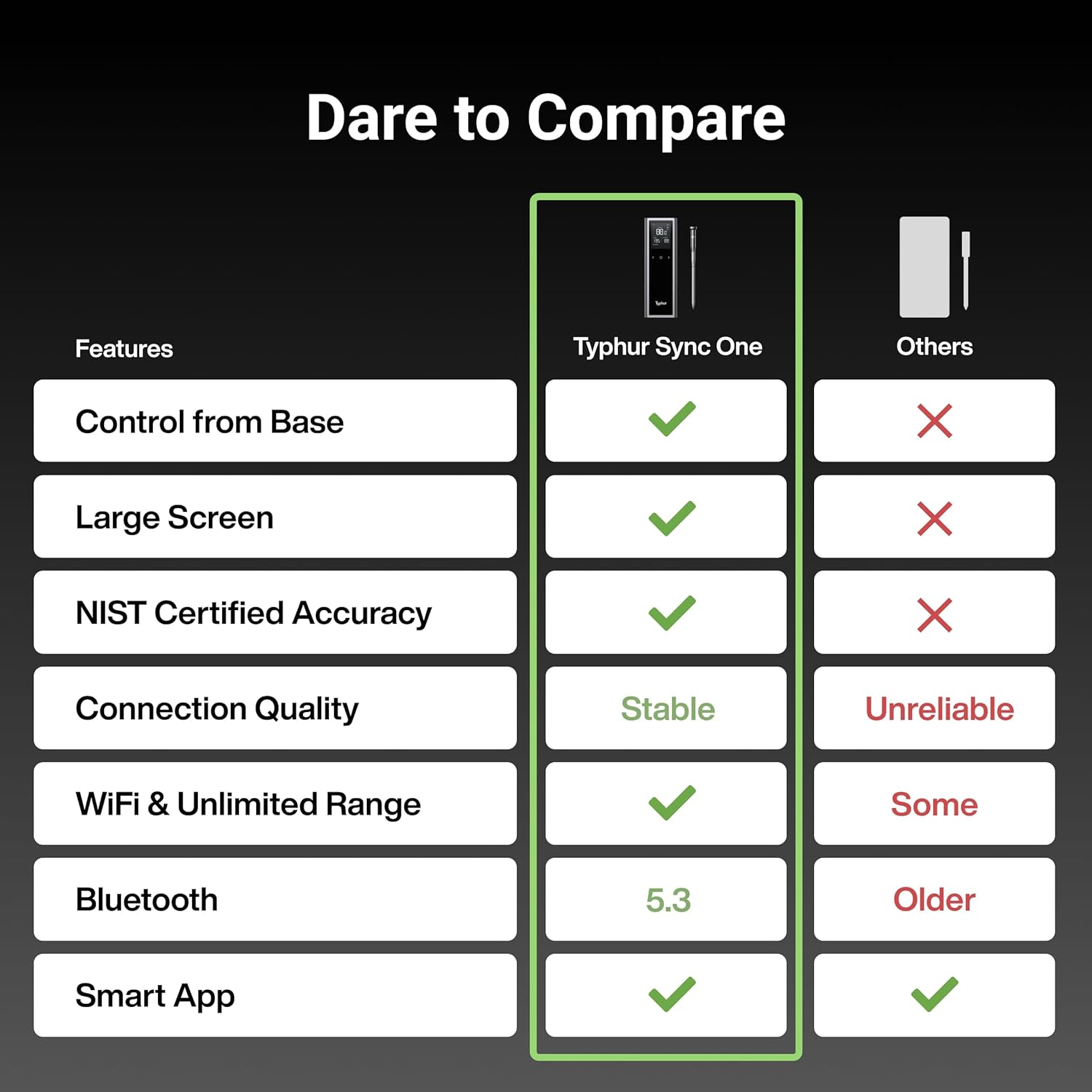 - 6 Sensors: Featuring 5 strategically placed internal sensors and an ambient sensor at the tip, the Typhur Sync wireless meat thermometer accurately measures doneness and intelligently predicts cooking completion using advanced algorithms.