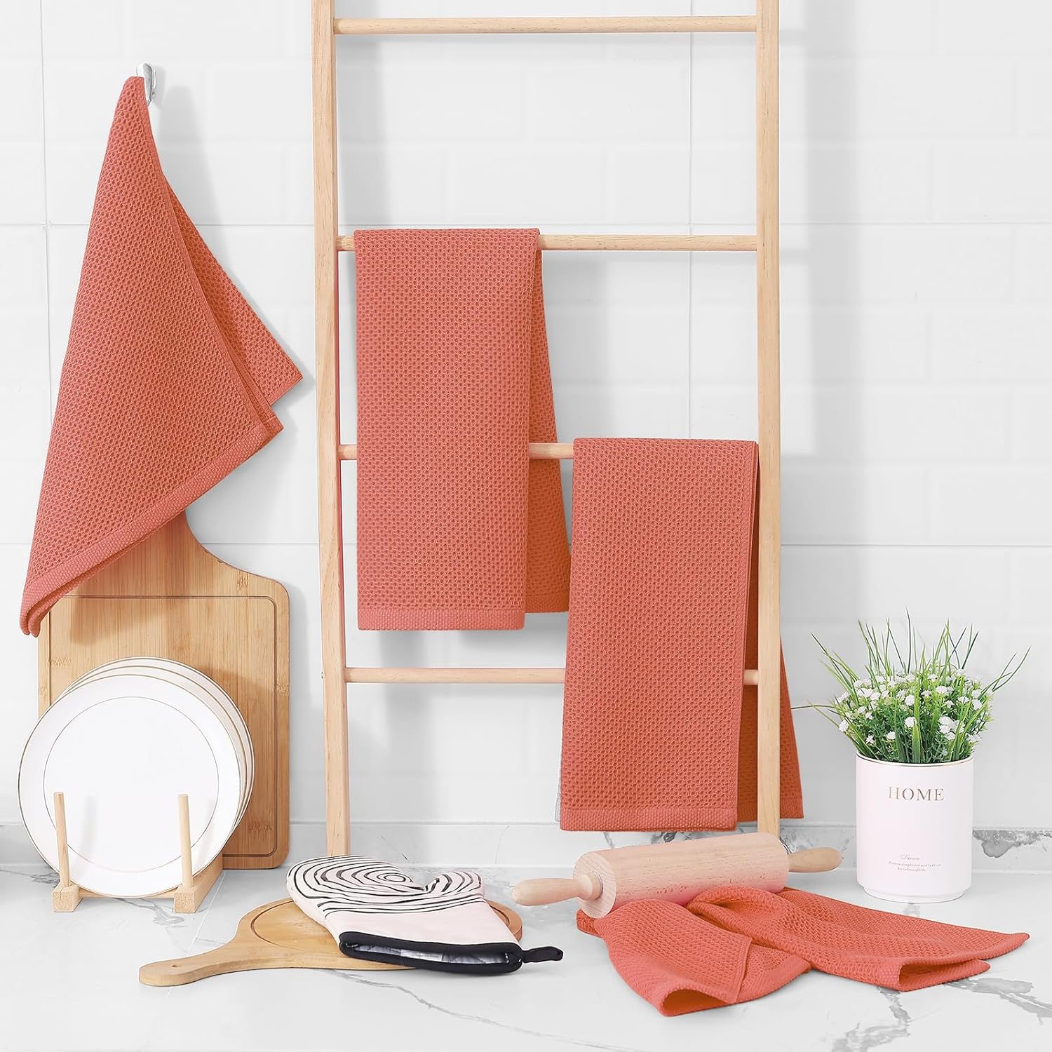 Homaxy 100% Cotton Waffle Weave Kitchen Dish Towels, Ultra Soft Absorbent Quick Drying Cleaning Towel, 13 x 28 Inches, 4-Pack, Coral