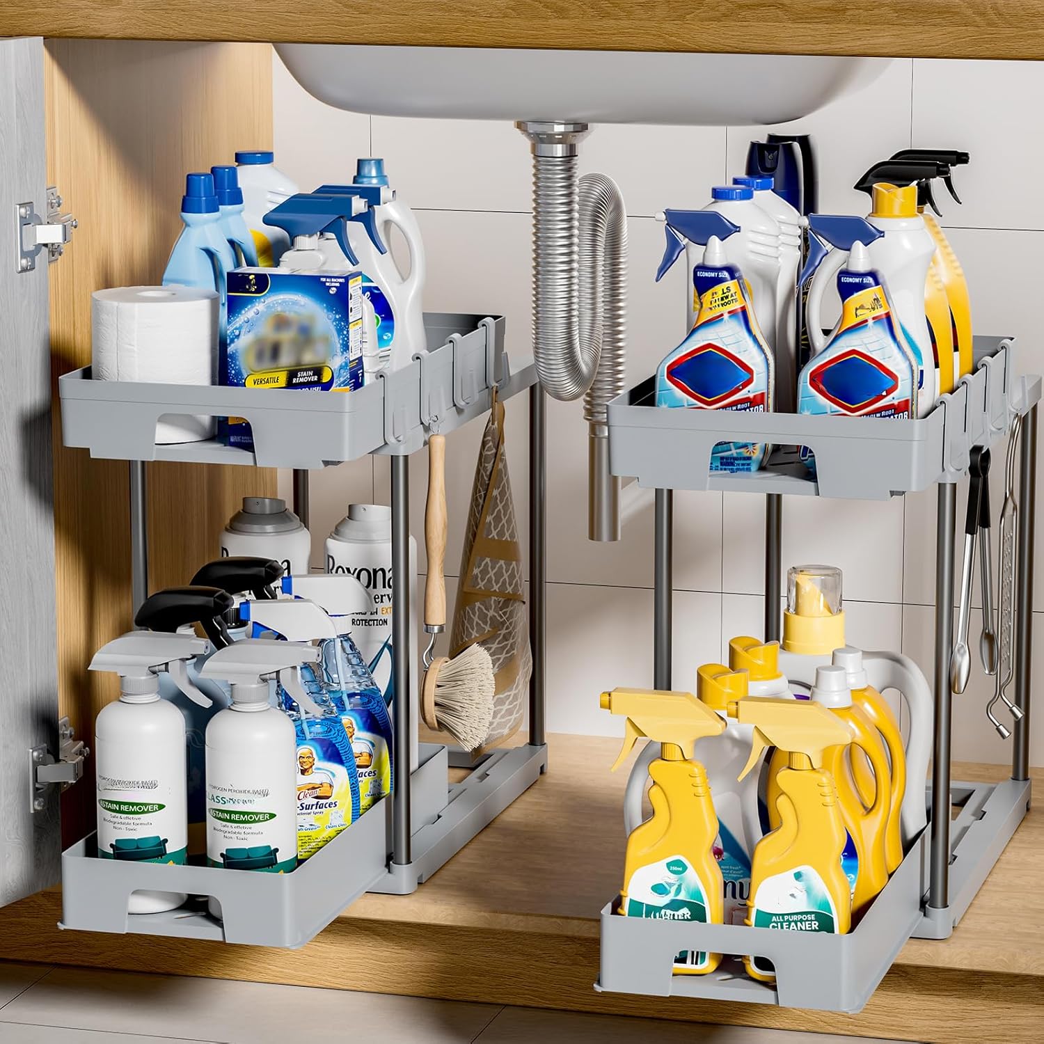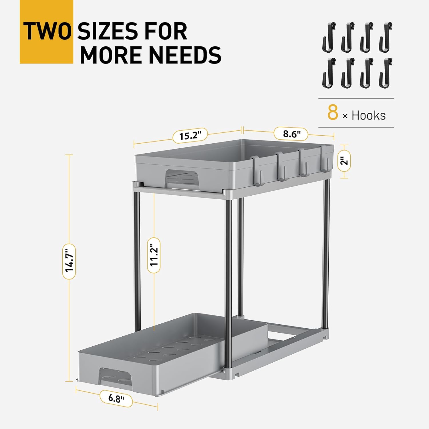 - Efficient Dual-Layer Pull-Outs: The double-drawer design of our under cabinet storage significantly enhances space utilization and accessibility. Our undersink organizers streamline both storing and retrieving items, and saving you time for cleaning supplies organizer, medicine cabinet organizer, and home organization.