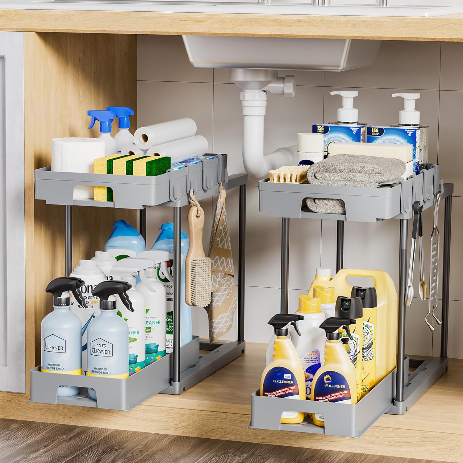 Delamu Under Sink Organizers and Storage, 2 Pack Pull Out Kitchen Bathroom Cabinet Organizer, 2 Tier Grey Under Sink Storage for Bathroom Kitchen