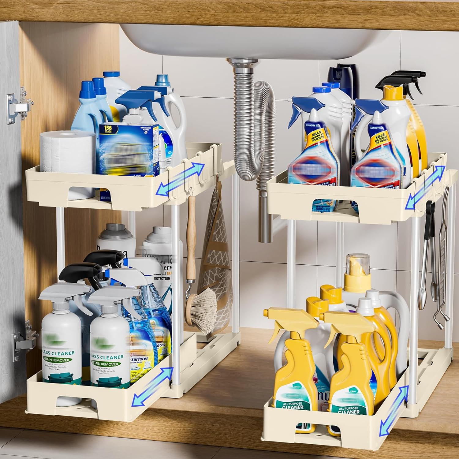 Delamu Under Sink Organizers and Storage, 2 Pack Pull Out Kitchen Bathroom Cabinet Organizer, 2 Tier Beige Under Sink Storage for Bathroom Kitchen