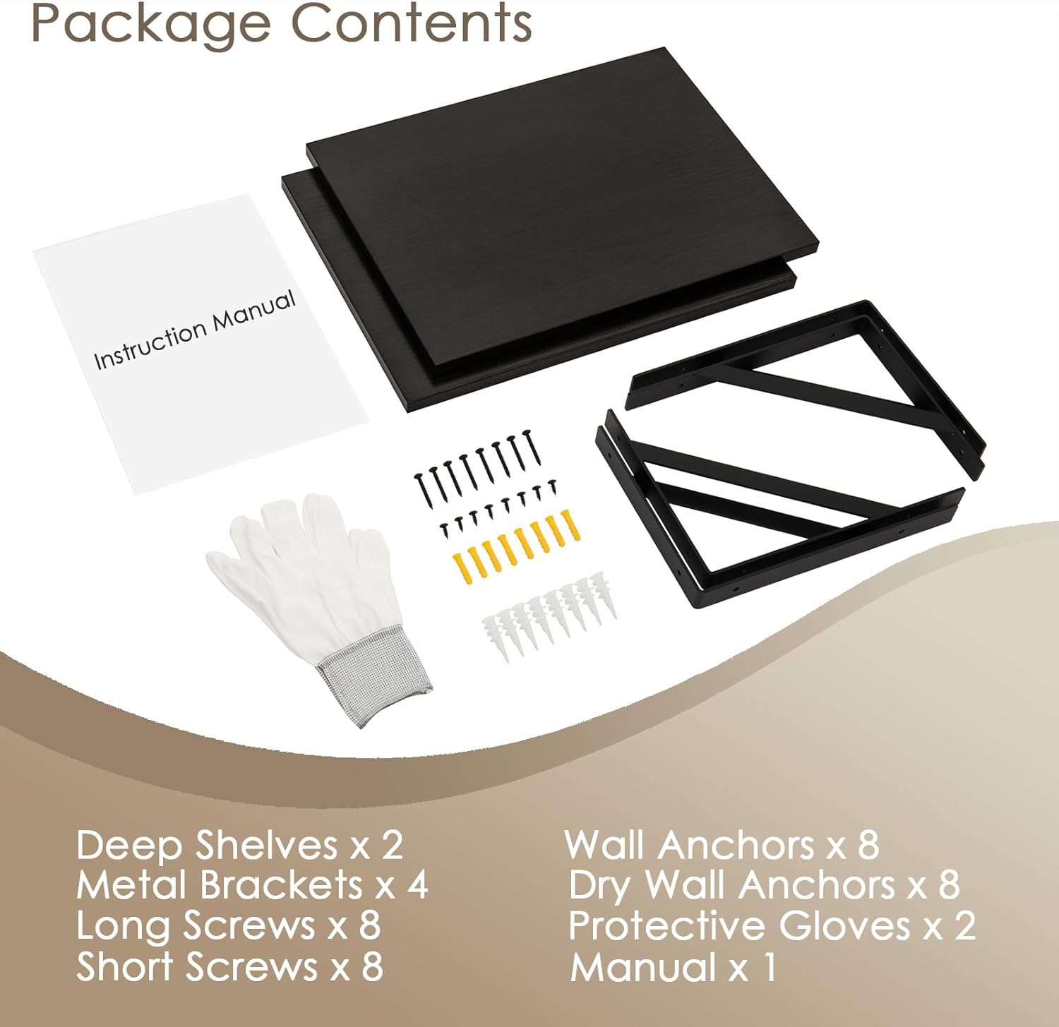 DINZI LVJ Deep Floating Shelves, 16" W x 12" D Wall Shelves Set of 2, Wide Display Shelf Wall Mounted with Brackets, Easy-to-Install Wall Bookshelf for Living Room, Bathroom, Bedroom, Espresso