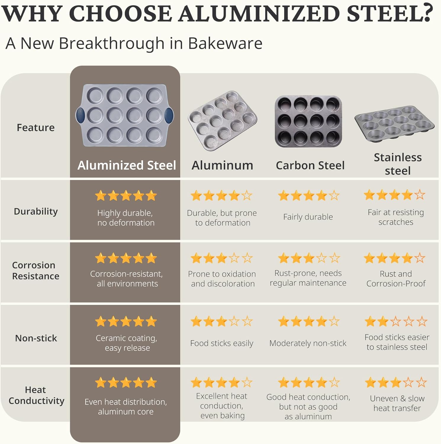 - Heavy-Duty Aluminized Steel : Our ceramic cupcake pans are crafted from high-quality aluminized steel, a new and advanced material offering 50% better corrosion resistance and durability compared to traditional pans. This innovative material provides even heat distribution, significantly reducing baking time and withstanding temperatures up to 500°F. Ideal for ovens, dishwashers, refrigerators, this muffin pan is designed to enhance convenience in every kitchen.