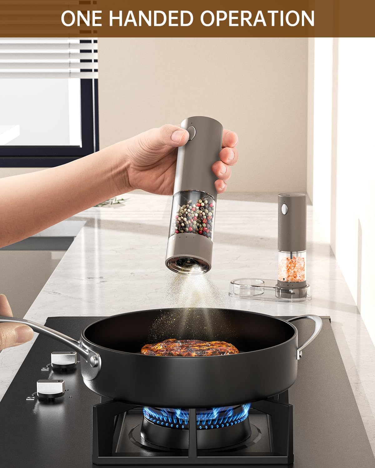 - ✔️ONE-HANDED OPERATION - With a simple press of the button, this rechargeable electric pepper grinder set offers effortless and user-friendly operation, allowing you to season your dishes with just one hand. The electric salt and pepper grinder set includes a transparent storage base to keep your grinders organized and your kitchen countertop tidy
