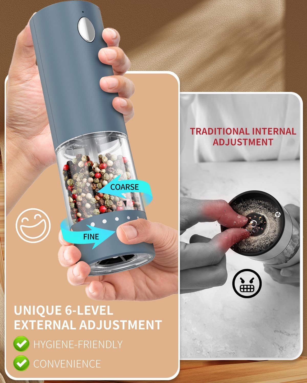 - ✔️USB CHARGING - The Type-C cable makes charging more convenient. Effortlessly recharge the salt and pepper grinder set anytime, anywhere, with the included USB-C cable. A full charge takes less than an hour, eliminating the need for frequent battery replacements and guaranteeing uninterrupted use(USB cable compatible with 5V adapter)