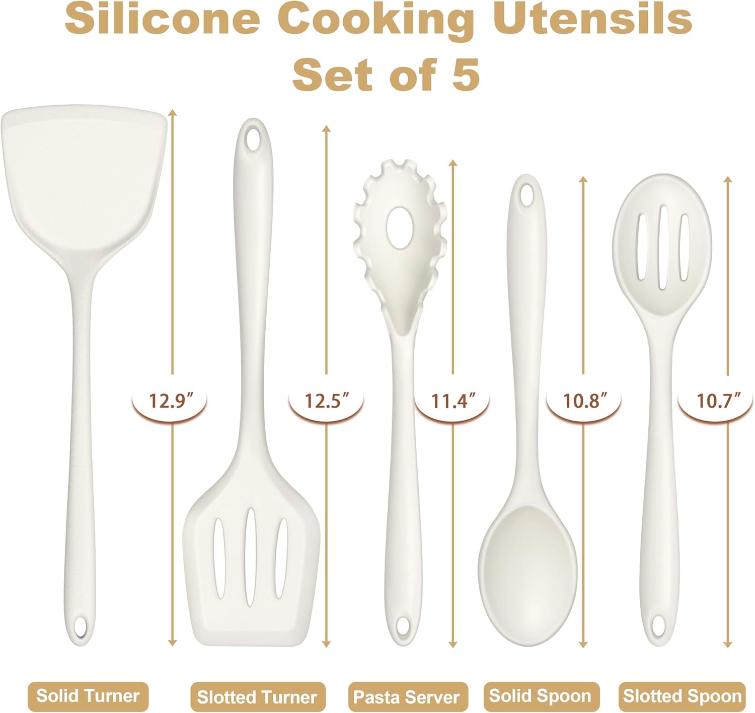 - 5 PIECE SET: Silicone cooking utensils set with different sizes and shapes for its’ various functions, Slotted and solid turner for frying, turning, flipping, Solid and slotted spoon for cooking, mixing, draining, Pasta Server for serving pasta, Great combination for cooking, Fit nicely for Housewarming / Thanksgiving / Birthday, etc.