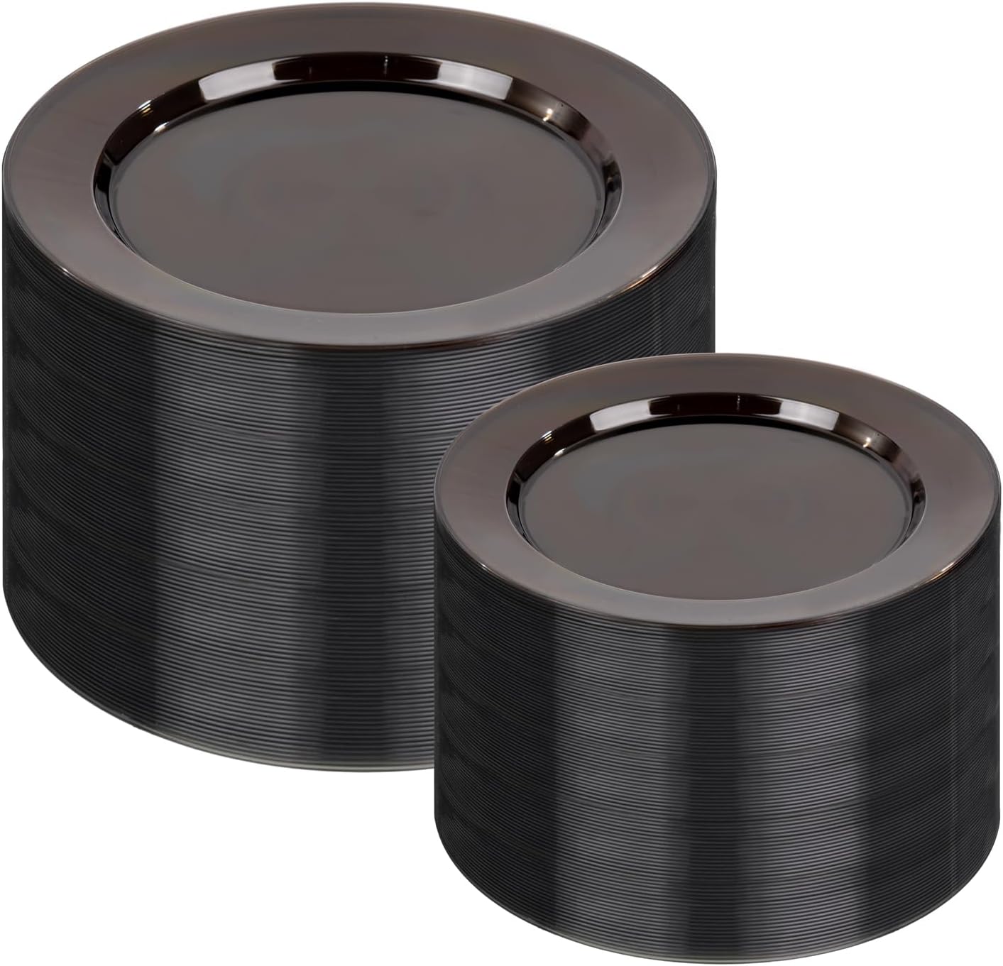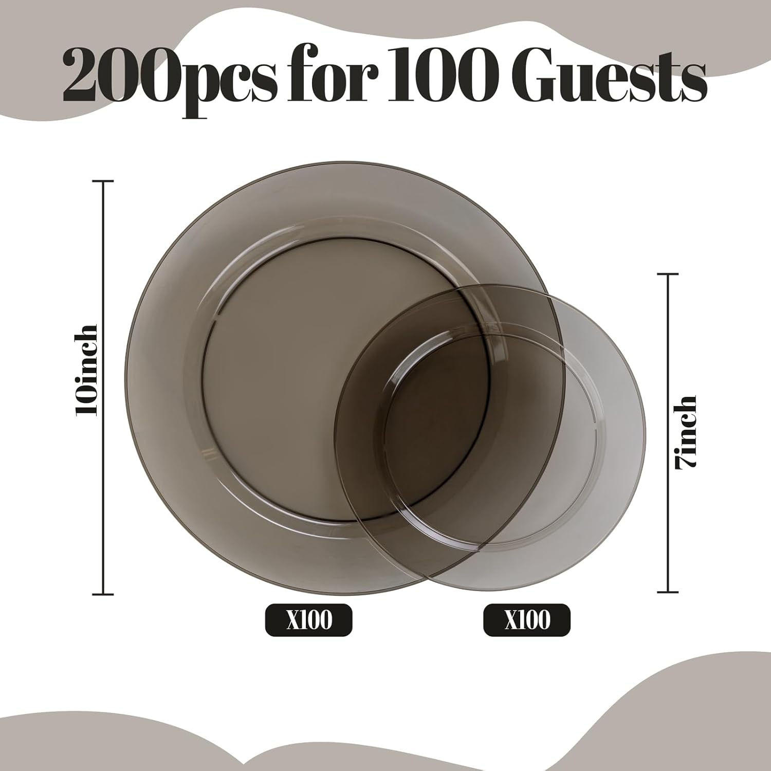 I00000 200 Pcs Clear Black Plastic Plates, Black Disposable Party Plates Include 100 Dinner Plate 10’’ and 100 Dessert Plate 7’’ Perfect for Birthday, Party & Wedding