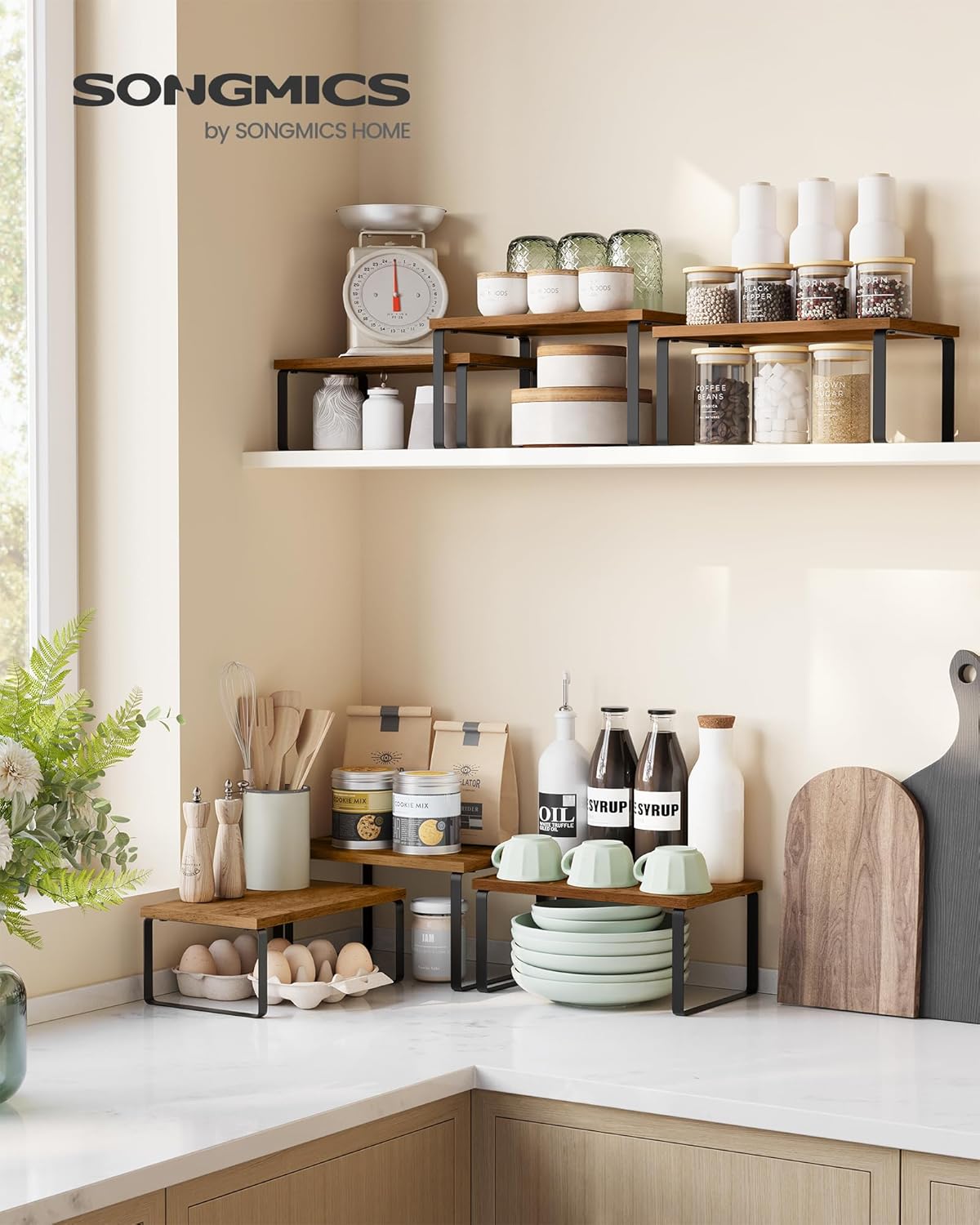 SONGMICS Cabinet Organizer Shelf, Set of 3 Kitchen Counter Shelves, Kitchen Storage, Spice Rack, Stackable, Expandable, Rustic Brown and Matte Black UKCS220K02