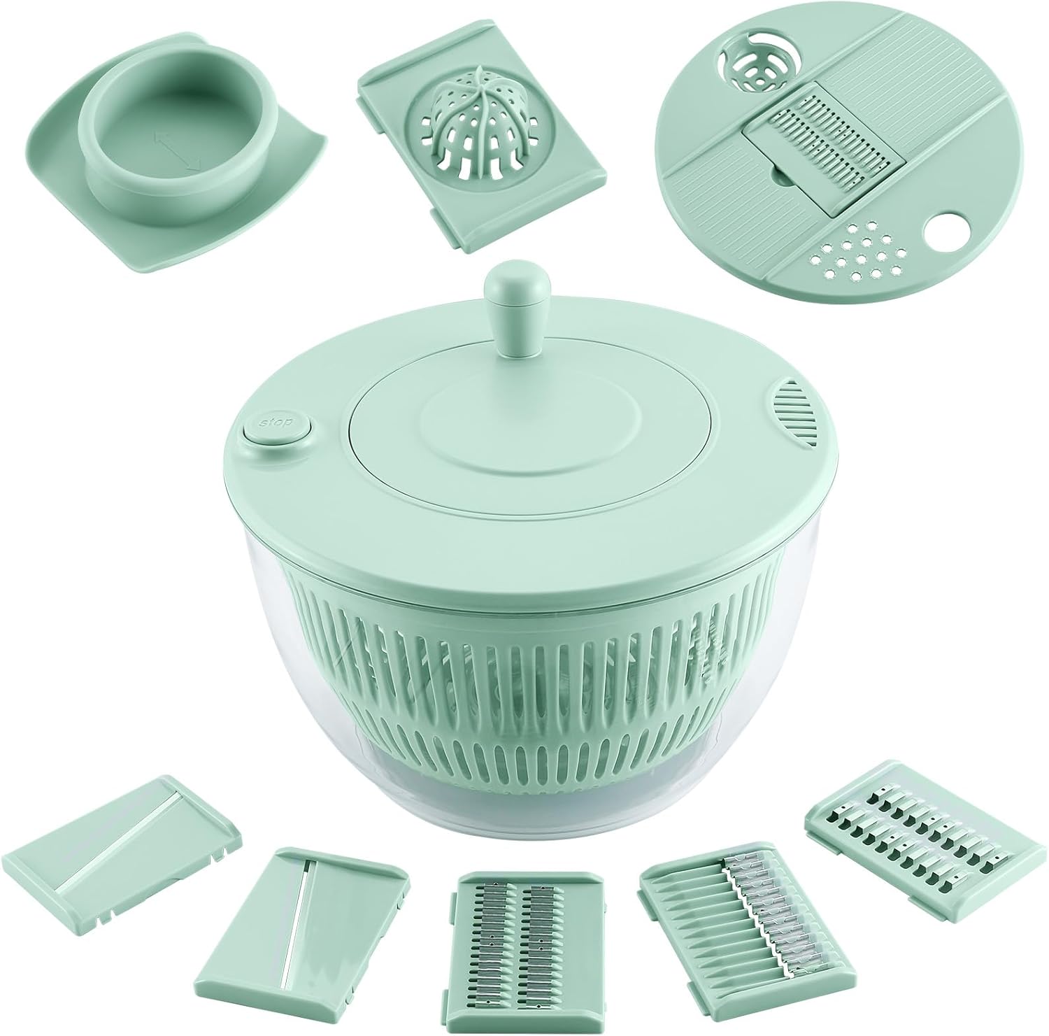 - 9 IN 1 Multifunction Kitchen Tool:Our Lettuce Spinner has 9 functions.It is a combination of a mandolin slicer and a salad Spinner.You can use it to squeeze lemon juice, separate eggs, wash vegetables, grind garlic, slice ingredients, and shred ingredients