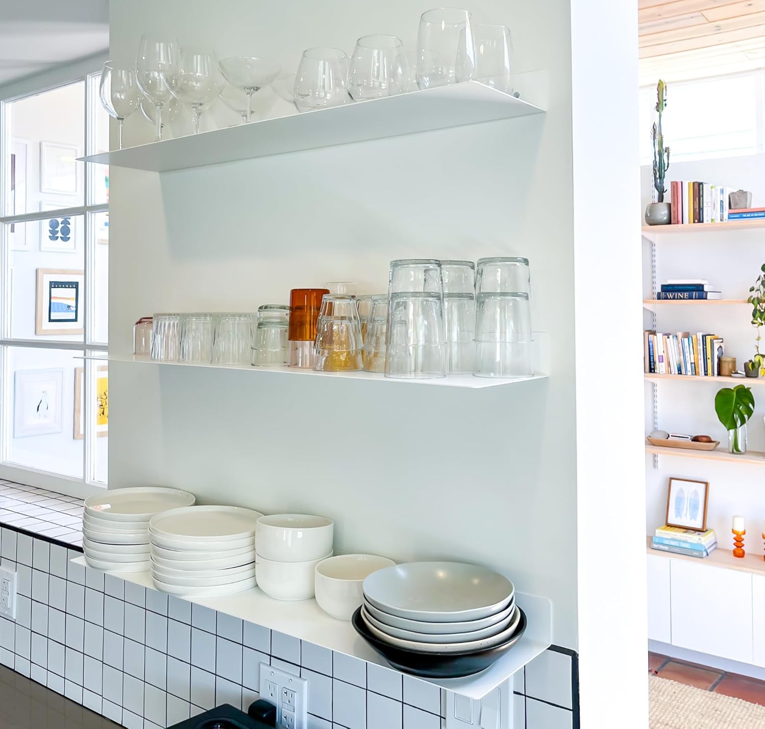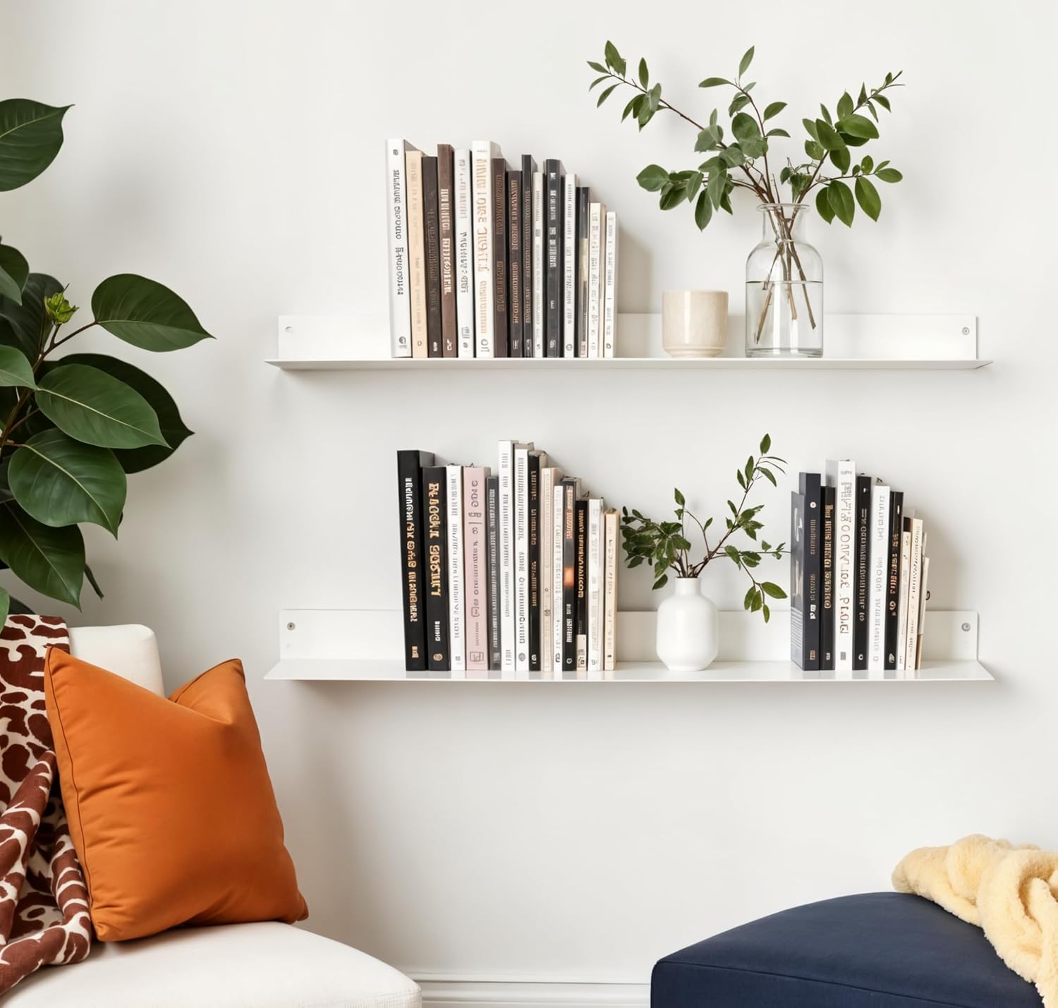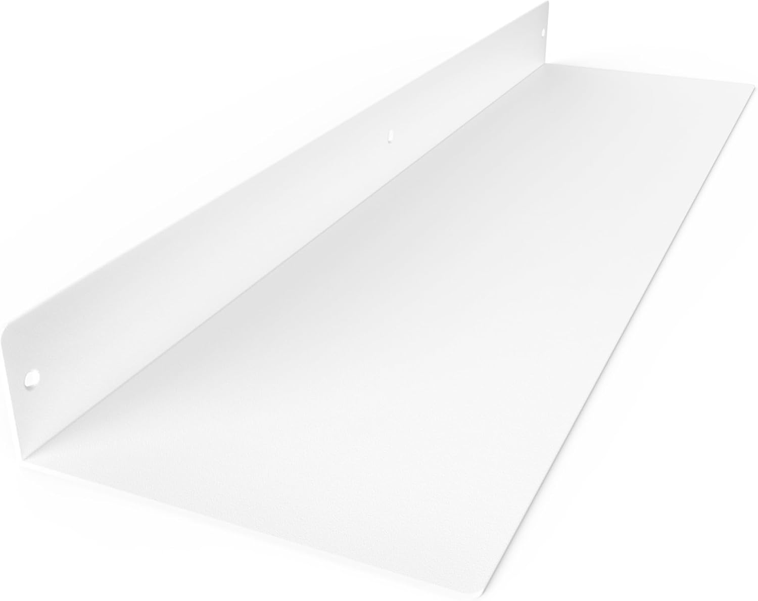 - DIMENSIONS & DETAILS: Measuring 30-inches long x 8-inches in depth, our steel floating shelf is made from 14 gauge raw steel and professionally powder coated white. The weight of the shelf is 6.5 LBS. It's perfect for displaying books, plants, bottles, picture ledges, and retail displays
