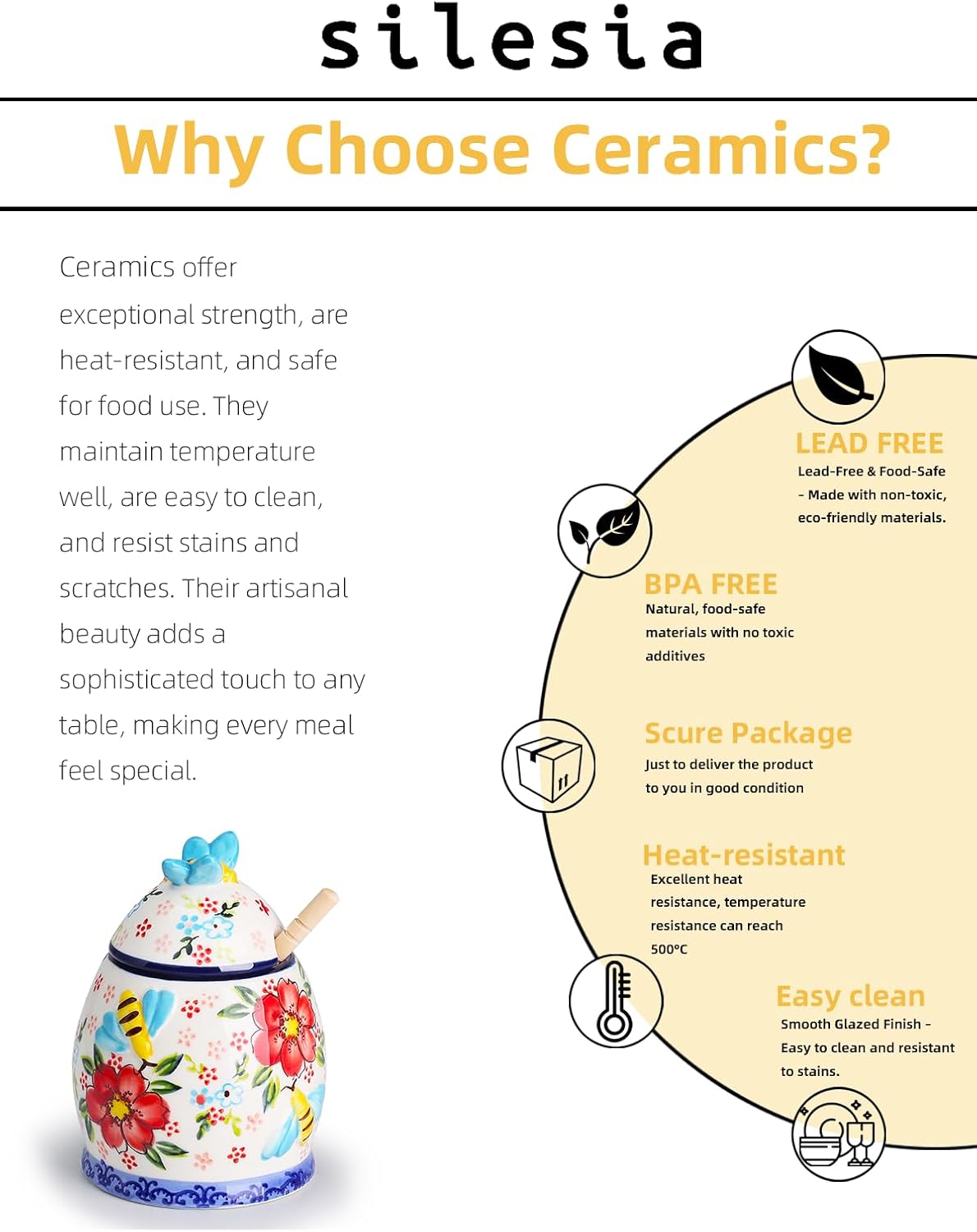 - Ceramic Materials: Crafted from lead free ceramic, this honey jar is built to last. it remains beautiful and functional over time. The smooth glaze also makes it easy to clean and maintain