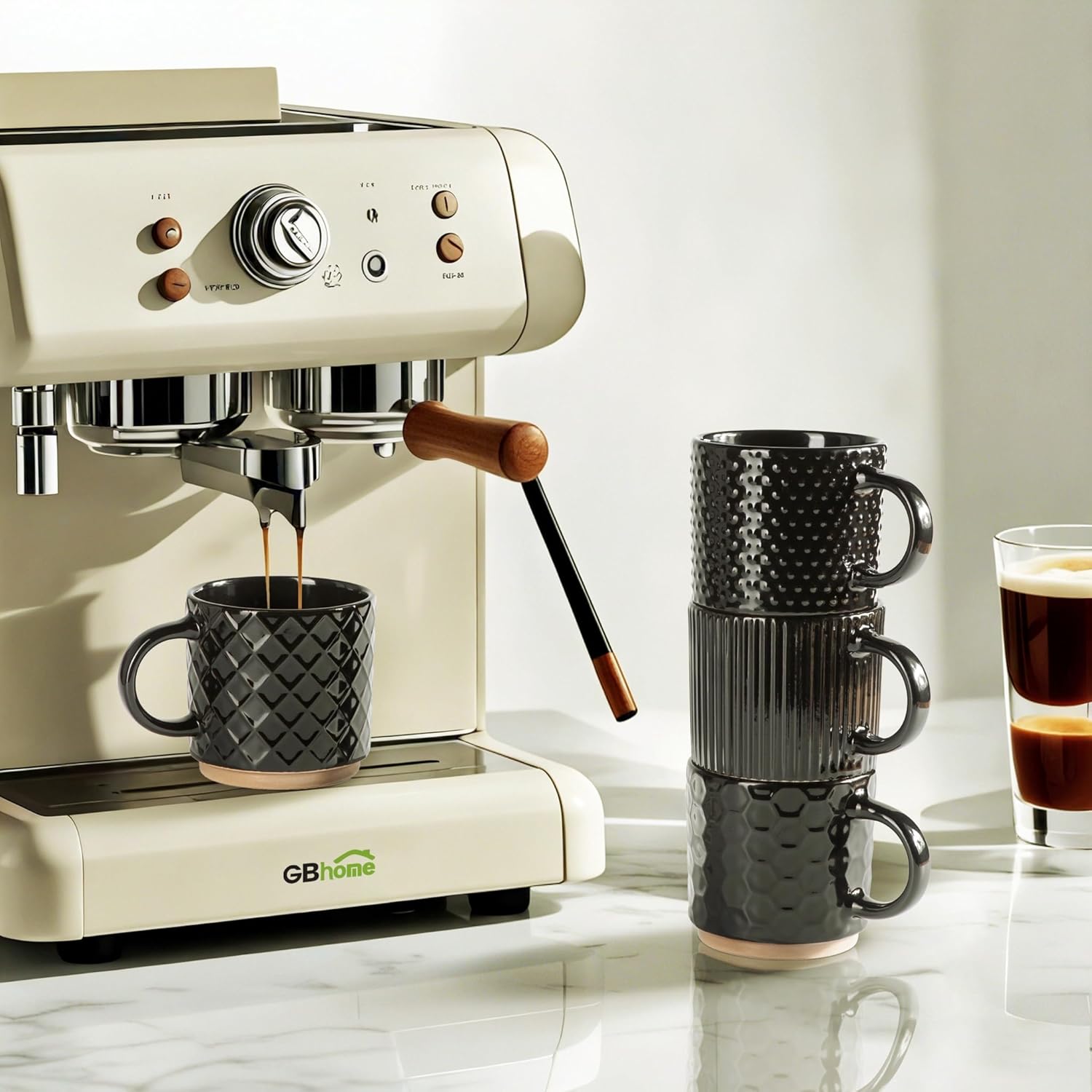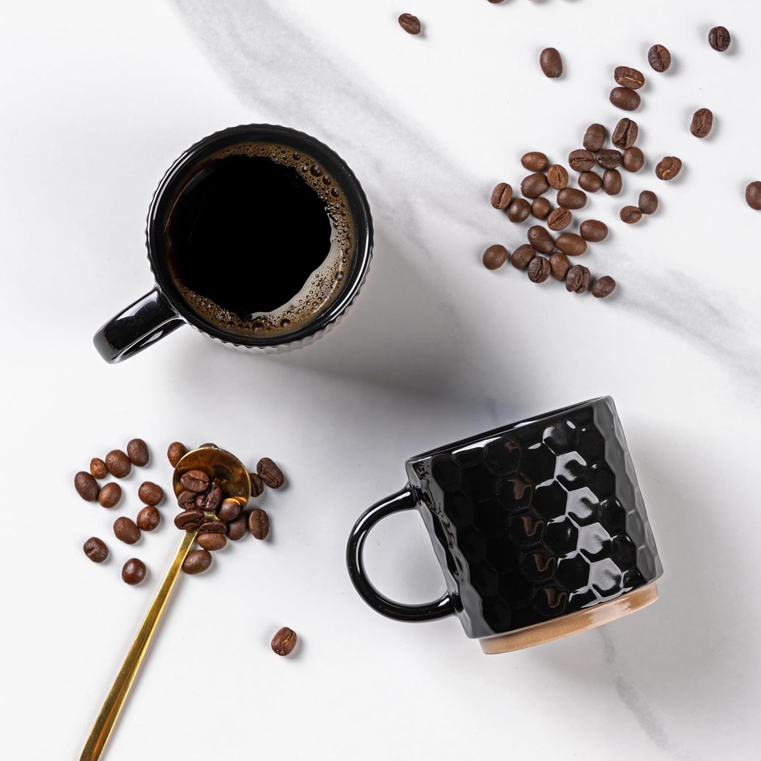 GBHOME 6OZ Stackable Coffee Mugs, Ceramic Coffee Mugs with Texture Patterns for Man,Woman,Dad,Mom, Modern Coffee Cups Set of 4 for Espresso/Cappuccino/Cocoa. Dishwasher&Microwave Safe, Black