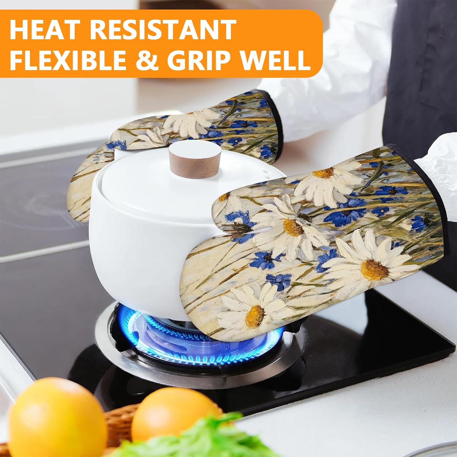 Daisy Flowers Oven Mitts and Pot Holders Sets 4Pcs,Extra Long Oven Gloves Potholder for Kitchen Cooking Baking BBQ 100% Cotton Heat Resistant