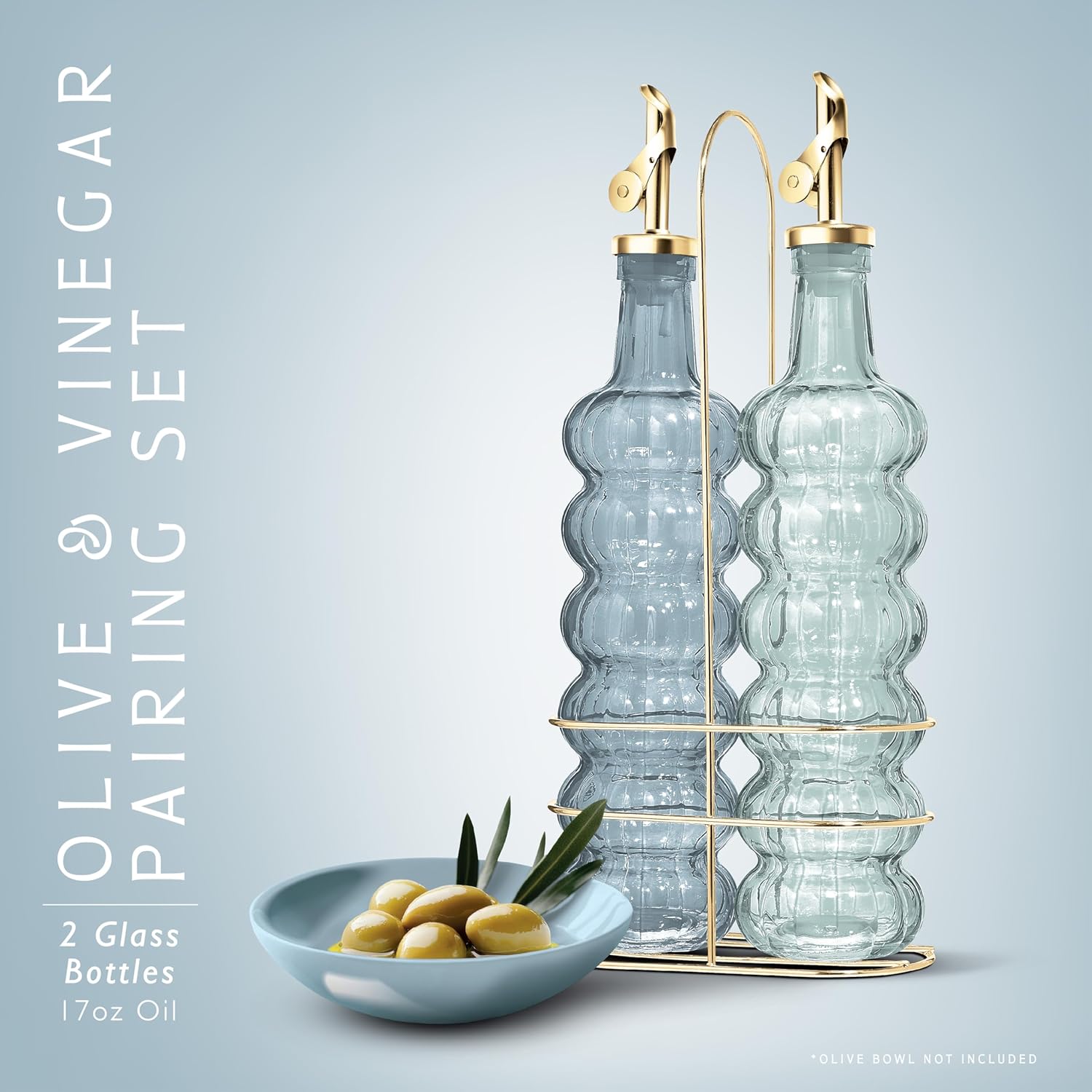 • Beautiful and Functional - Our colored glass oil dispensing bottles, with elegeant colors, gold tops and gold wire rack, will elevate your kitchen. Don't use just any oil bottle, upgrade the way you cook. That's our mission.