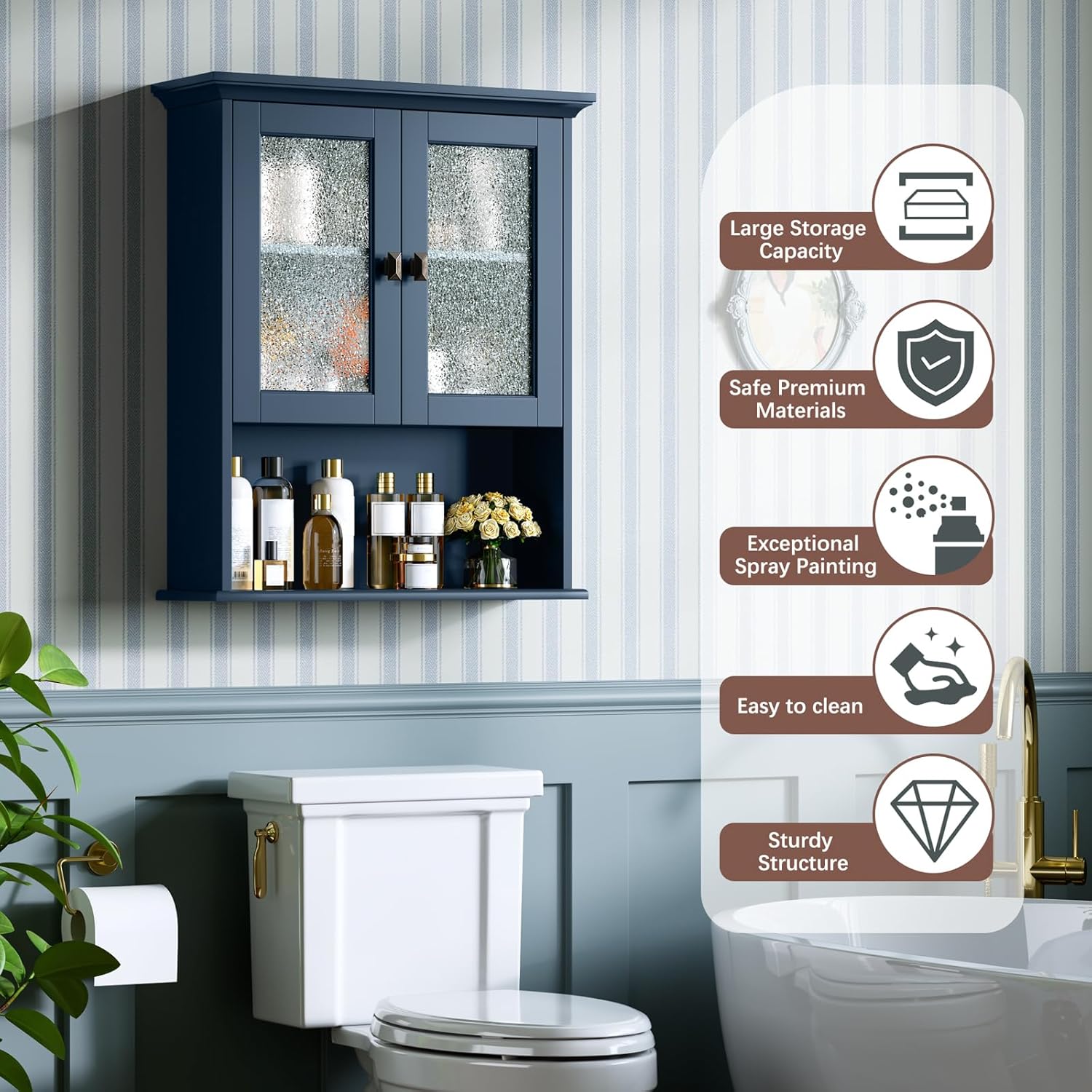Bathroom Cabinet Wall Mount, Medicine Cabinet Over Toilet Storage Cabinet with Glass Door Build-in Spirit Level Cupboard Hanging Storage for Bathroom Laundry Kitchen Living Room (Ultramarine)