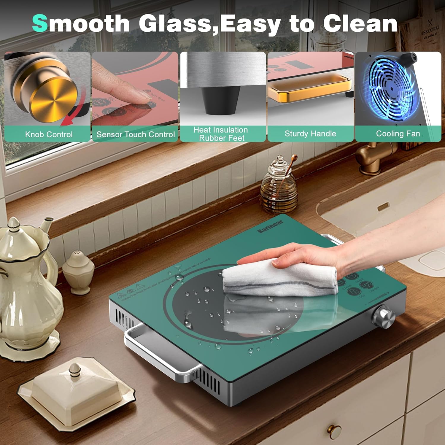 Karinear Portable Electric Stove 110V, 1800W Electric Hot Plate with Handle, Knob Control Single Burner Electri Cooktop, Ceramic Infrared Countertop Burner, Timer, Safety Lock(Green)