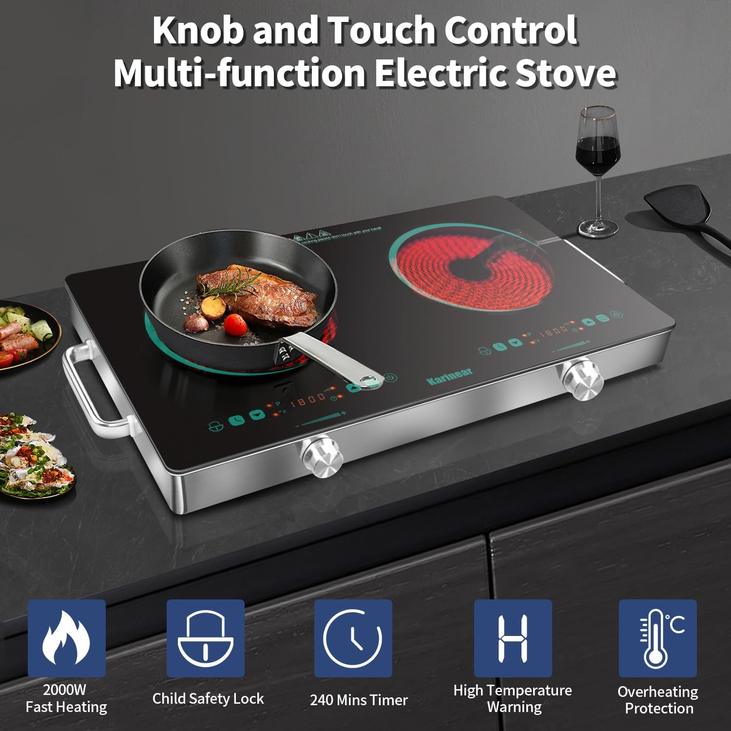 - 【Safe and Smart Cooking Features】Safety is our top priority. This electric cooktop 2 burners include a child safety lock to prevent accidental operation, an overheat protection system, and a residual heat indicator that flashes "HOT" until the surface cools down. Additionally, you can set a timer up to 240 minutes, ensuring your meals are cooked to perfection without constant supervision.