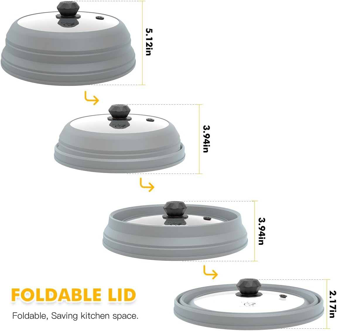 Microwave Splatter Cover Vented Glass Splatter Guard Lid with Collapsible Silicone for Food as Pot Cover Plate 9.8 inch Light Grey