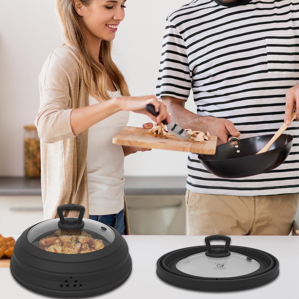 - 【UNIQUE HANDLE】: Splatter guard lid with easy grip silicone round handle, 100% Tempered glass, 100% food grade, BPA Free and dishwasher safe, It can also be used as a common pot cover, Convenient multi-purpose pot cover.