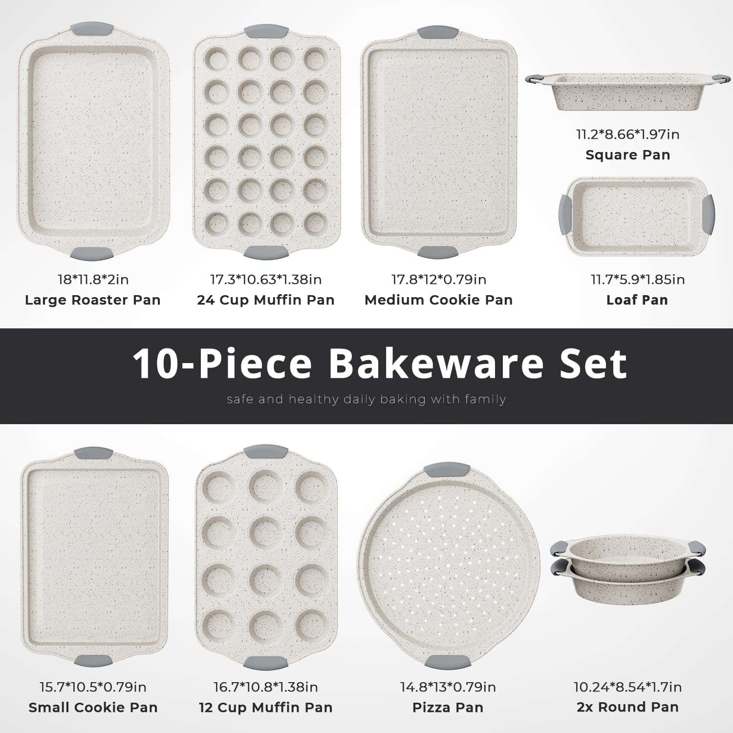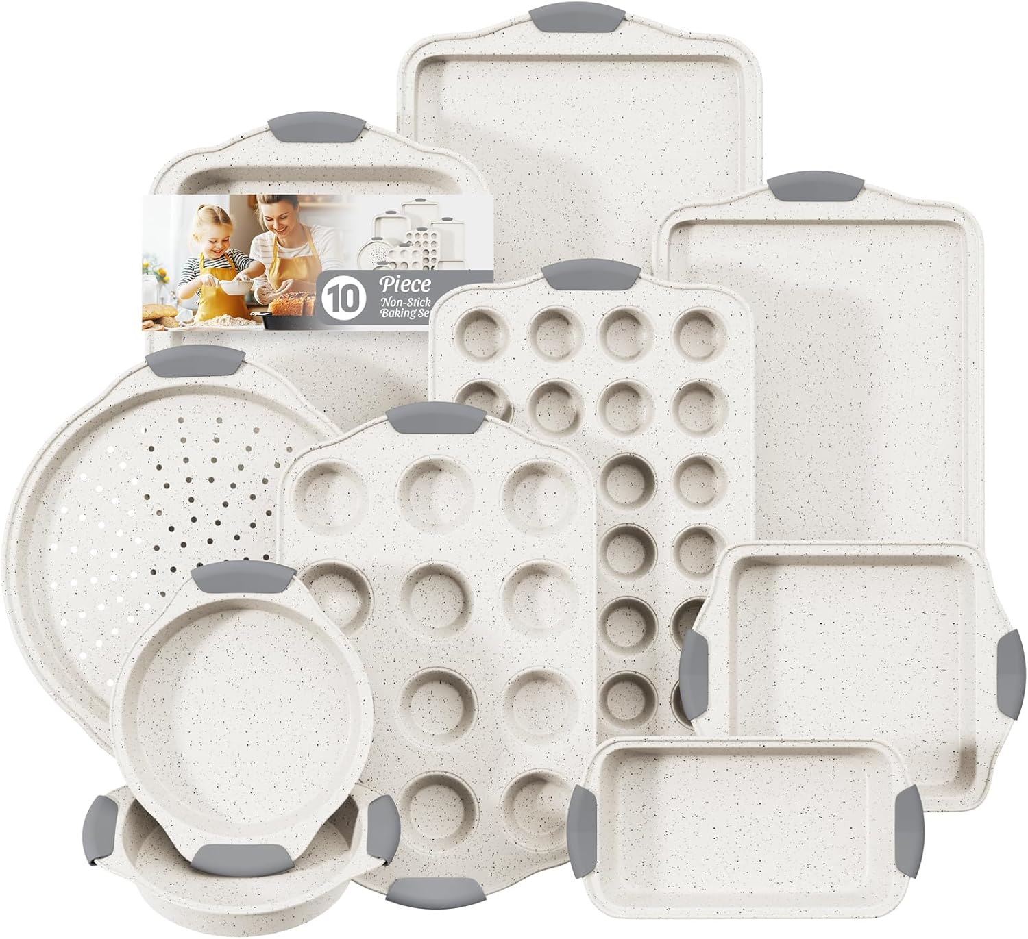 10-Piece Nonstick Baking Pans Set, Stackable Non Toxic Bakeware Sets with Cookie Sheets, Cake Pan, Loaf Pan, Pizza Pan, Muffin Pan, White&Gray