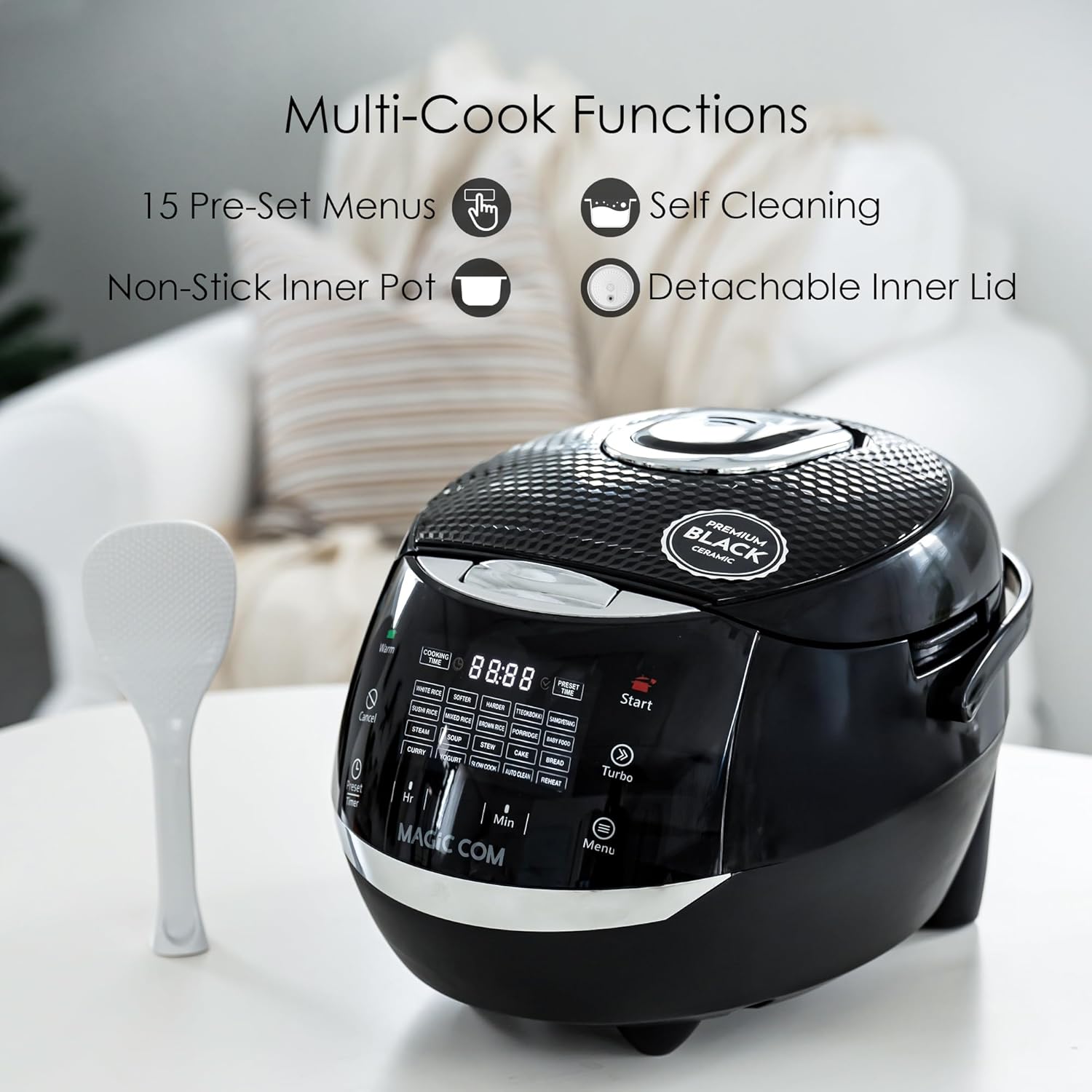 MAGiC COM Rice Cooker, 10 Cup(Uncooked) 20 Cup(Cooked) One Touch Healthy Cooking with 15 Menu Modes, Nonstick Inner Pot, Steamer Basket, Auto Clean, 24 Hour Delay Timer and Auto Keep Warm (Black)
