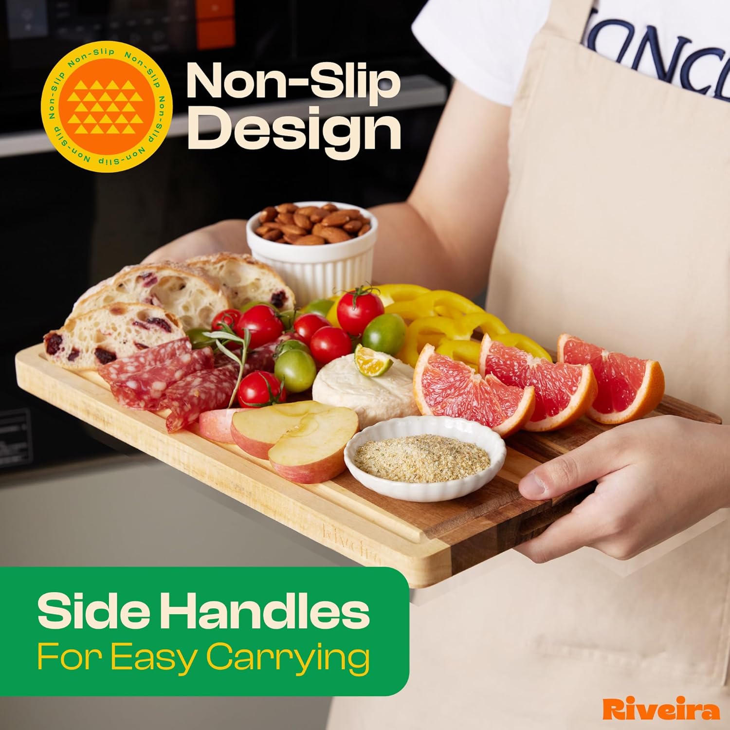 - Premium Crafted Acacia — Take a detour from traditional kitchen aesthetics with this acacia wood board crafted from 100% natural acacia. Beyond being an unconventional and eco-friendly choice, the chopping board wood proudly showcases the environment friendly and organic acacia. This wood cutting boards for kitchen counter adds an unexpected touch of confidence and style to your once-orderly culinary space. Riviera's wooden chopping boards for kitchen will be there for many years to come.