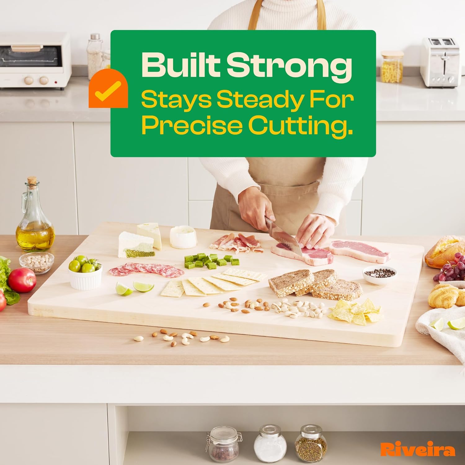 - Premium Crafted Maple — Take a detour from traditional kitchen aesthetics with this maple wood board crafted from 100% natural maple. Beyond being an unconventional and eco-friendly choice, the chopping board wood proudly showcases the environment friendly and organic maple. This wood cutting boards for kitchen counter adds an unexpected touch of confidence and style to your once-orderly culinary space. Riviera's wooden chopping boards for kitchen will be there for you for many years to come.