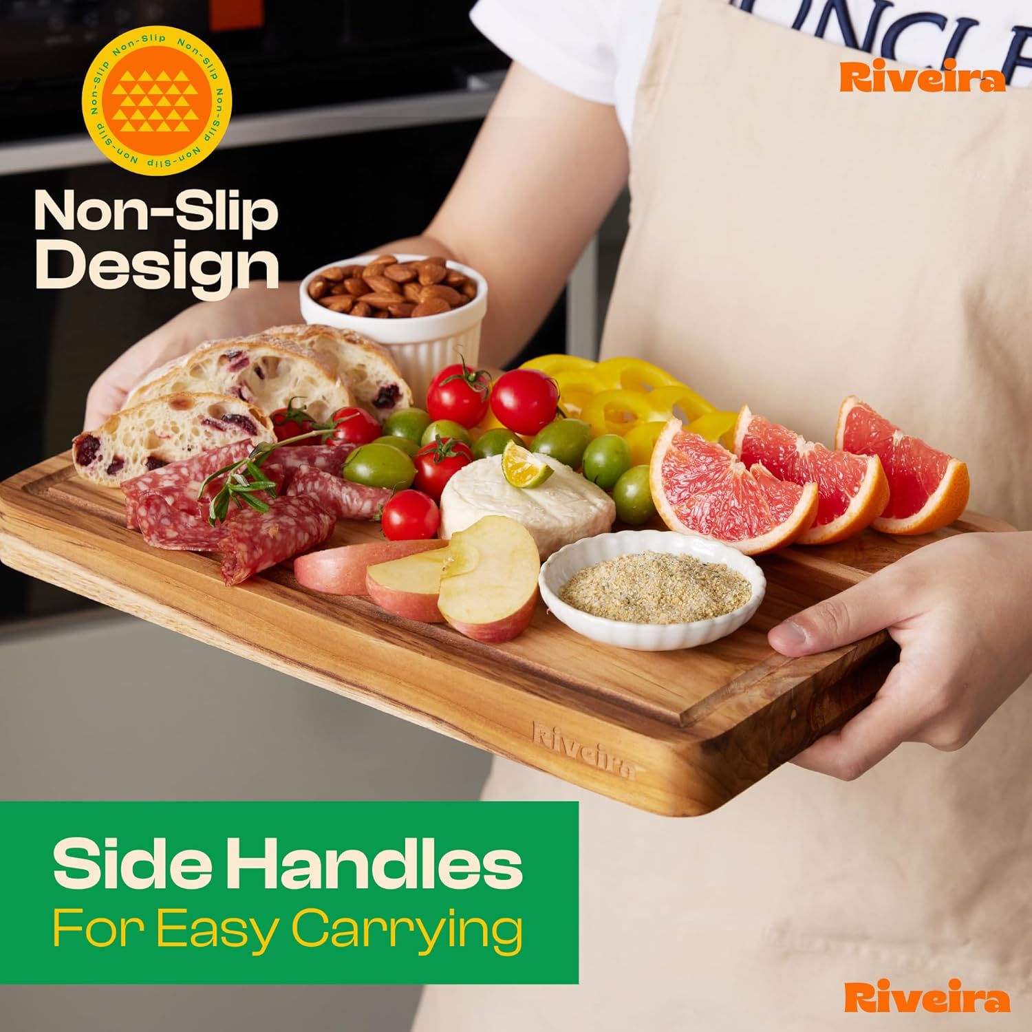 - Handle Everything with Confidence — The built-in handle holds of the teak cutting boards are designed for handling everything with confidence and easy maneuvering. Pre-oiled and ready for immediate bewilderment, this wooden chopping board is not just convenient for the kitchen mess but has a unique design to maintain, ensuring a performance that is both comfortable and clean for chopping boards for kitchen. Riviera non toxic cutting boards for kitchen will be perfect in your kitchen.