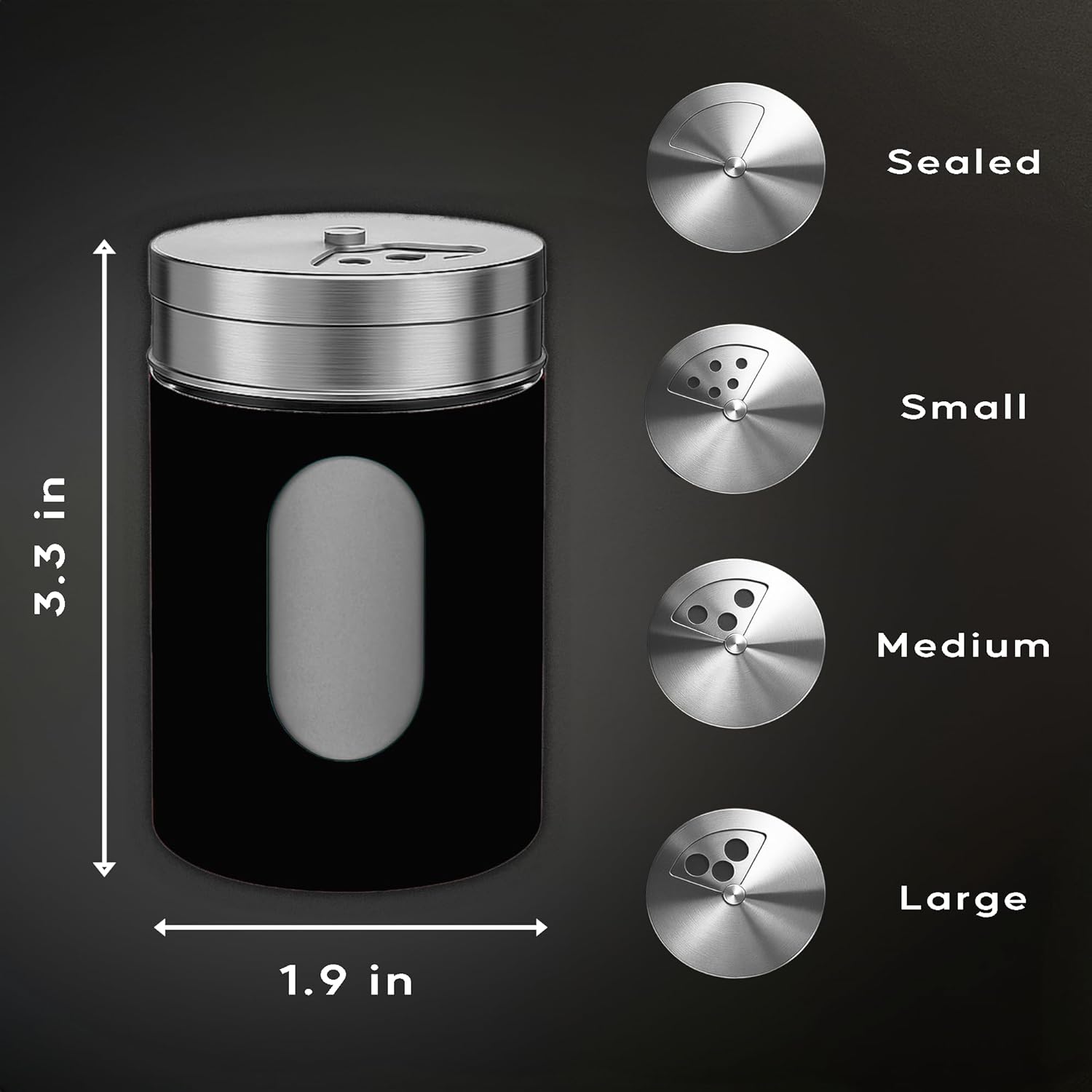 4-Piece Premium Stainless Steel Salt and Pepper Shakers Set – Adjustable Pour Holes Spice Dispenser for Salt, Sugar, Cinnamon, and Pepper – Stylish Kitchen Seasoning and Spice Shaker Set (Black)