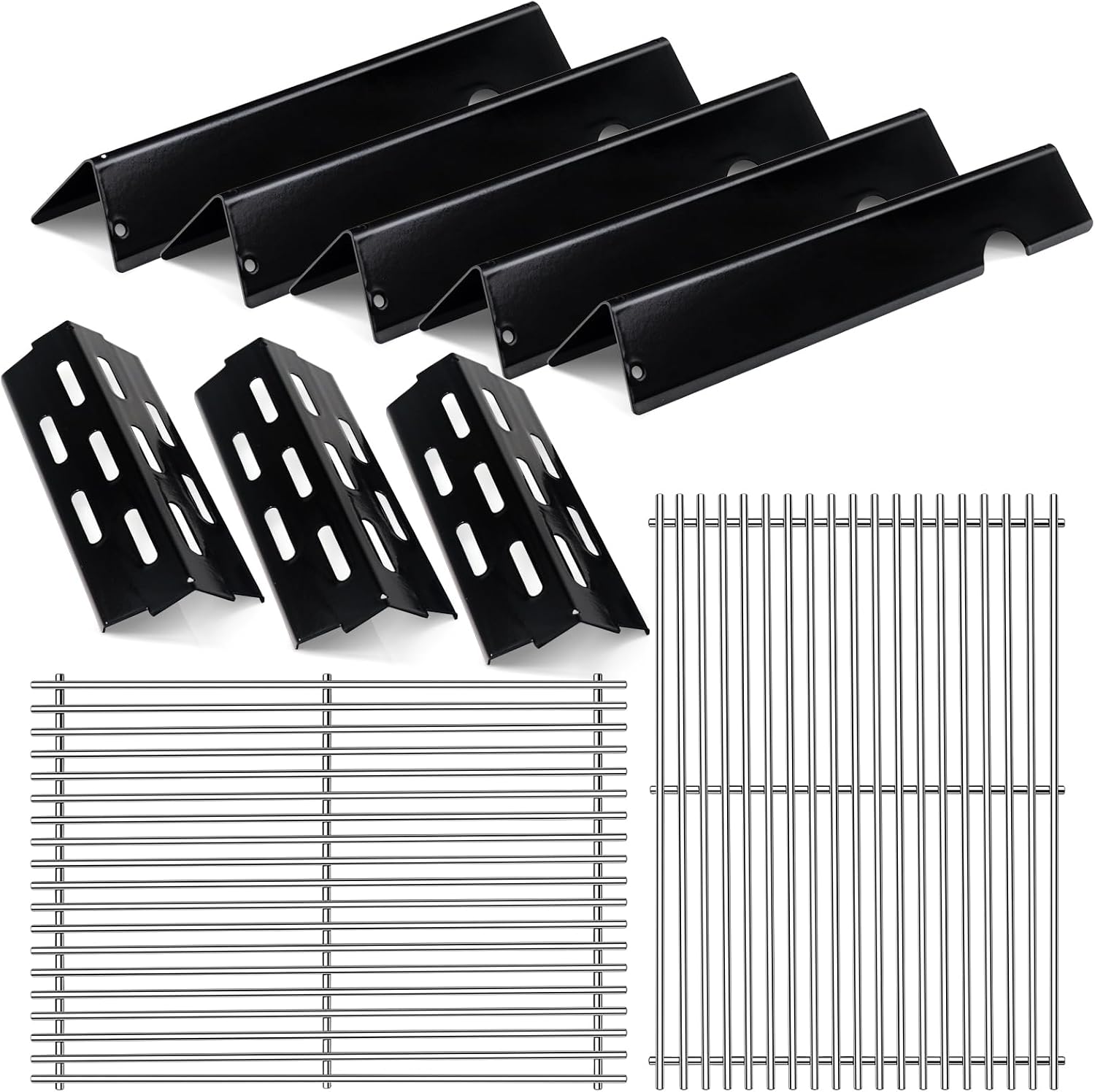 - 【Grill Replacement Parts Dimensions】5 Pack Grill Flavor bars: 17-1/8"L x 3"W, 3 Pack Heat Deflectors: 12-1/2"L x 4-1/4"W,Cooking Grates:18-3/4" x 13-1/4”for each grate, 18-3/4" x 26-1/2”for 2pcs total, grill grates: 7mm thickness, Please double check the size of your original parts and compare with our grill replacement parts before ordering.