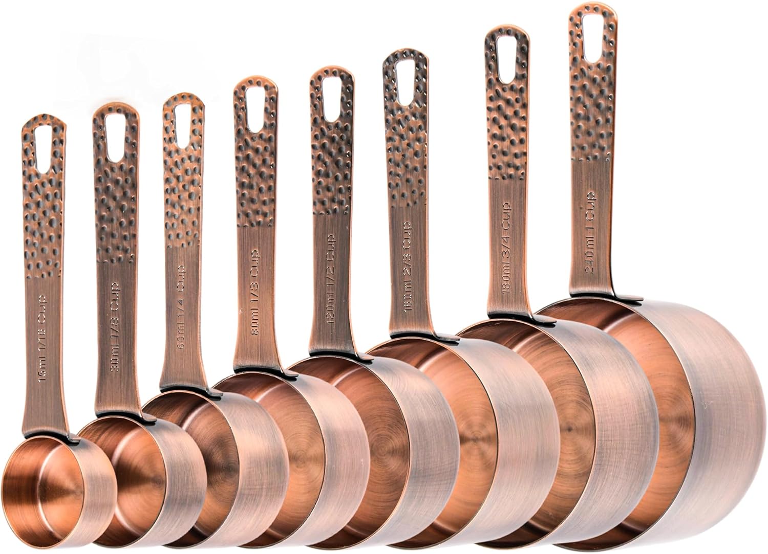 - 8 Copper Measuring cups set: 1/16cup 15ml, 1/8cup 30ml,1/4cup 60ml,1/3cup 80ml,1/2cup 120ml, 2/3cup 160ml, 3/4cup 180ml, 1 cup 240ml; 9 Copper Measuring Spoons Set:1/8tsp 0.63ml, 1/4tsp 1.25ml, 1/2tsp 2.5ml, 1 tsp 5ml,1/2tbsp 7.5ml, 1 Tbsp 15ml.<br>Ingredient Leveler, Measure Equivalents & Locking Rings.