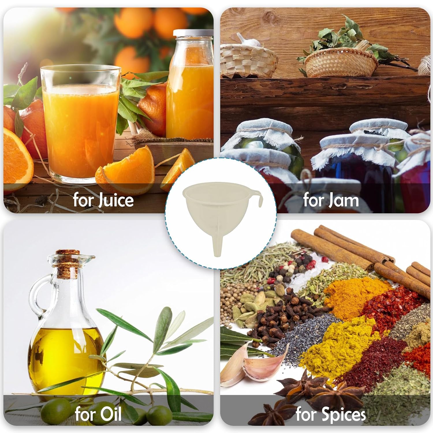 - Practical Design: Featuring a convenient hanging hole, these funnels can easily be hung for storage when not in use, saving valuable space. The round spout ensures smooth pouring without spills, making it perfect for liquids like oil and juice.