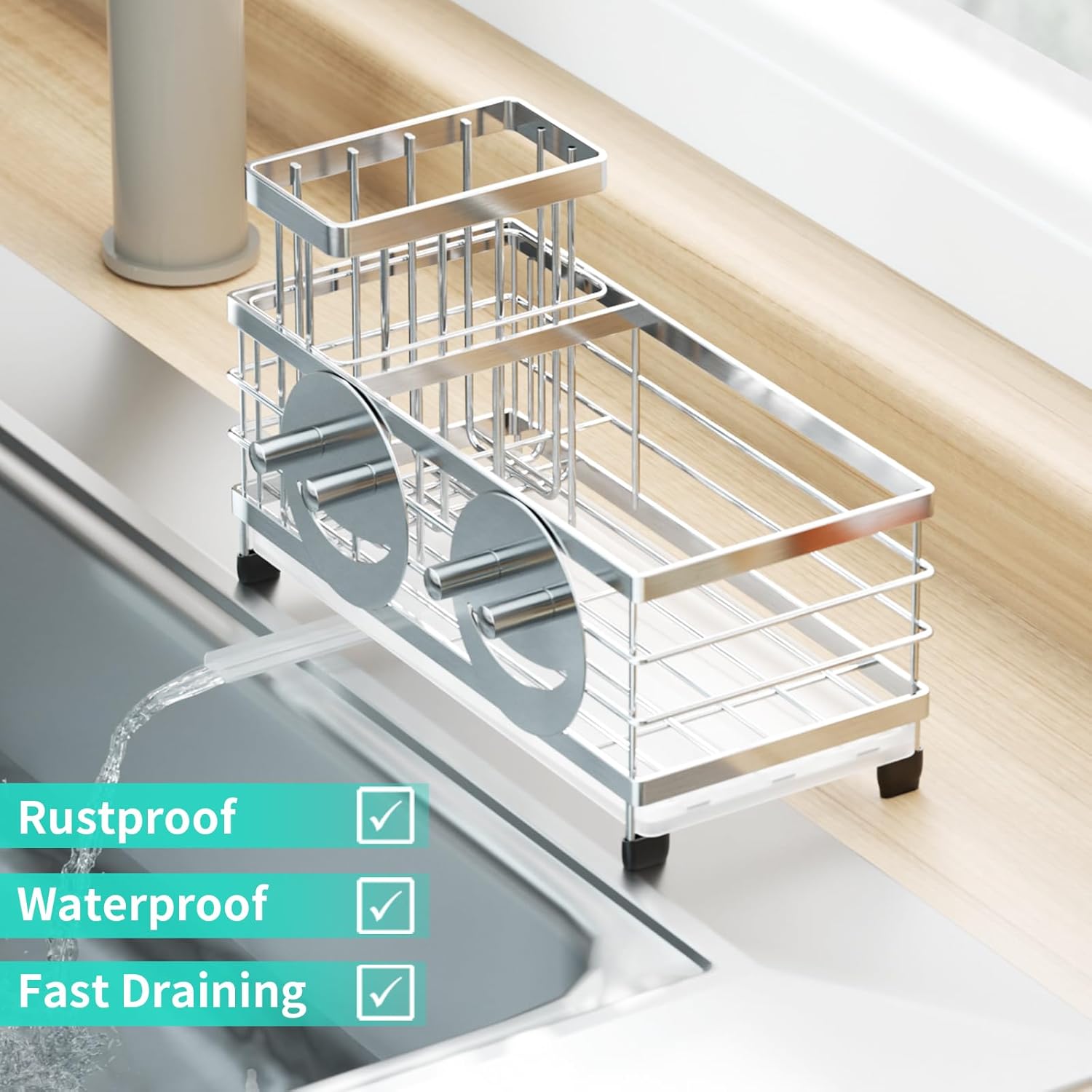 - [360° Rotating Drainage]: The 360° rotating drainage pipe on our sponge holder ensures your kitchen stays dry and clean, effortlessly directing water into the sink. The drain pipe is removable, so you can remove it for cleaning