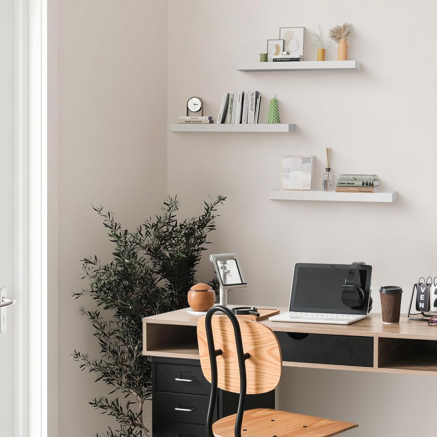 - VERSATILE AND STYLISH DESIGN: Elevate your space with our wall shelves available in wood, black, and white. These floating shelves come in three sizes (15 inches, 24 inches, and 36 inches) and feature a natural wood texture that blends seamlessly with any decor style.