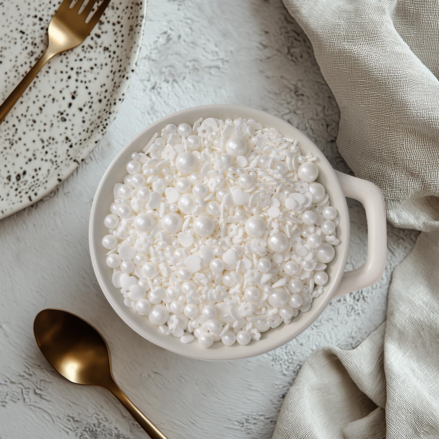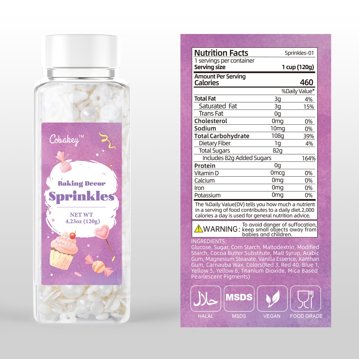 - Pearl Sprinkles: Each bottle weighs 4.23oz, 120g. Our white sprinkles are made from safe ingredients. Our cake sprinkles are in different shapes of Heart and Pearl Sprinkles.