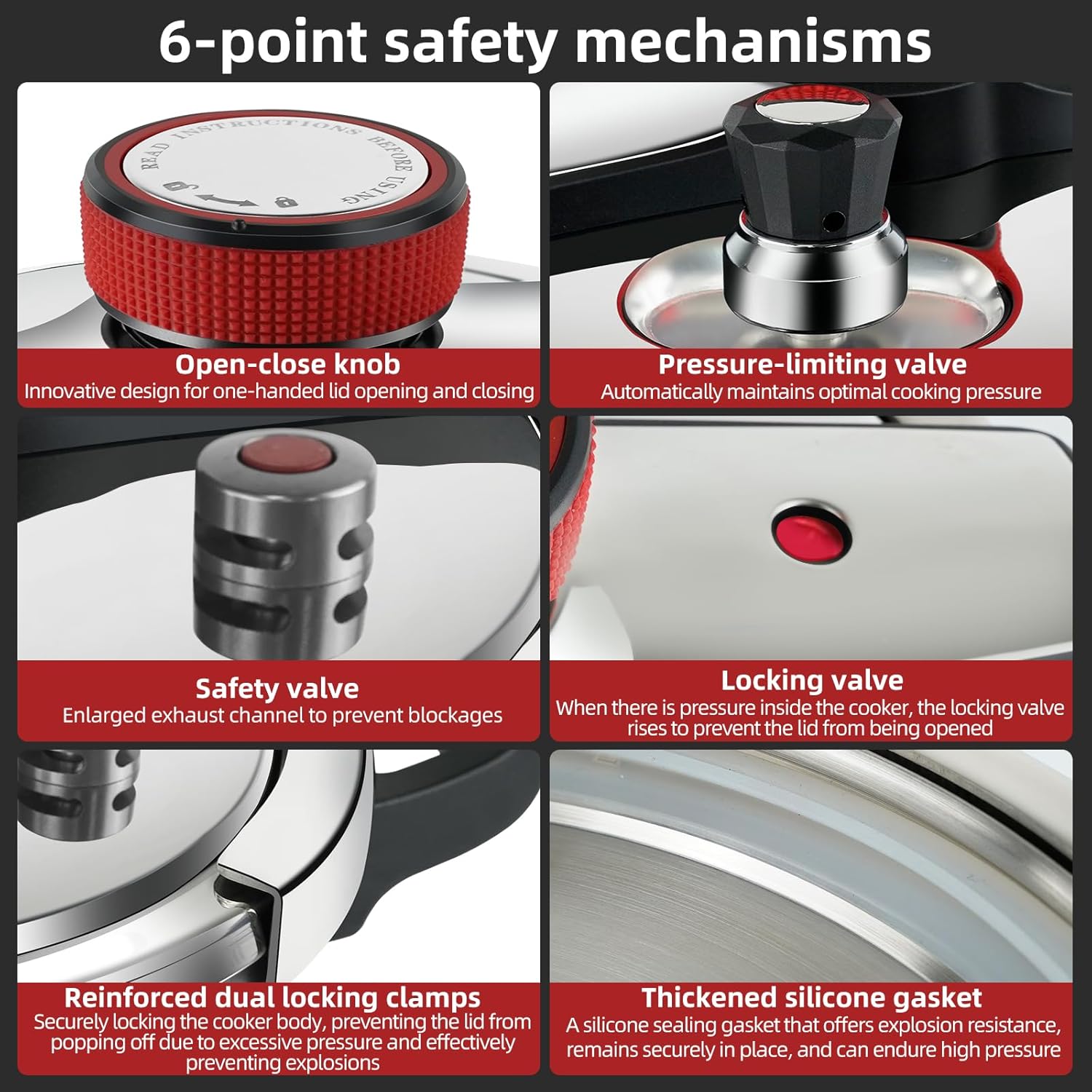 - ✅[Ultra-safe construction]-Our 6-quart pressure cooker is filled with safety-enhancing features, such as an easy-to-lock lid, pressure-limiting valve, safety valve, locking valve, and reinforced dual locking clamps to ensure risk-free cooking.