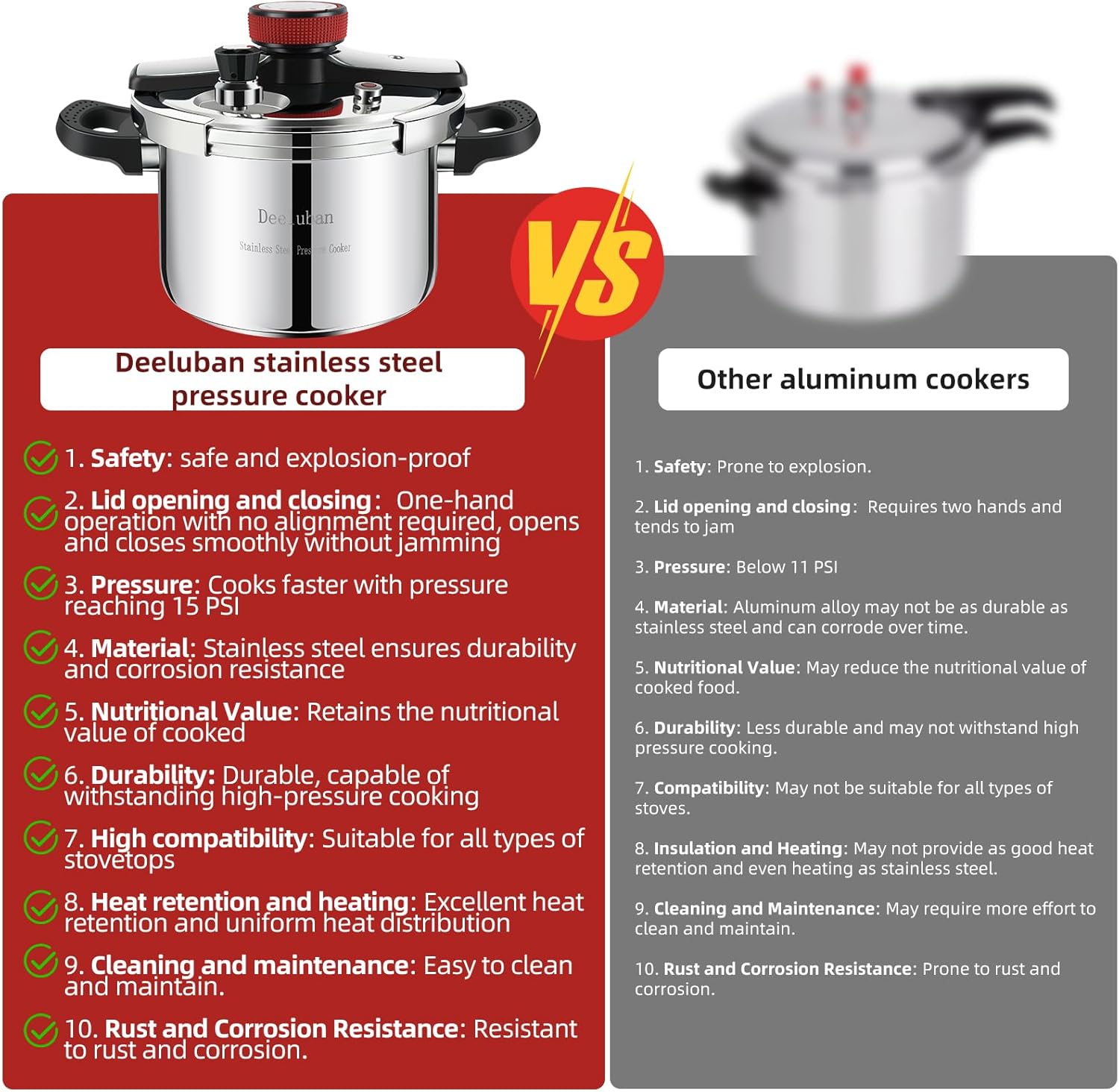 - ✅[High pressure and fast cooking]-Compared with traditional cookers, the Deeluban pressure cooker reduces cooking time by at least 70%, speeds up cooking with 15 PSI pressure, and helps preserve the precious nutrition and flavor of food. For example, it can tenderize beef tendons in 15 minutes and cook a whole chicken in just 10 minutes.