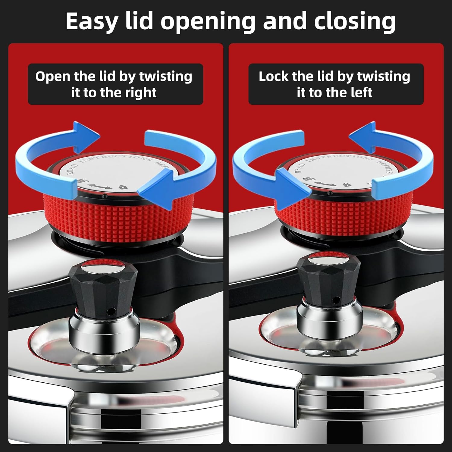 - ✅[Unique easy-to-lock lid system]-This pressure cooker uses an innovative design for one-handed lid opening and closing, and the lid can be locked or opened in any position by turning the knob with one hand. If the pressure inside the pot increases, the lid cannot be unlocked.