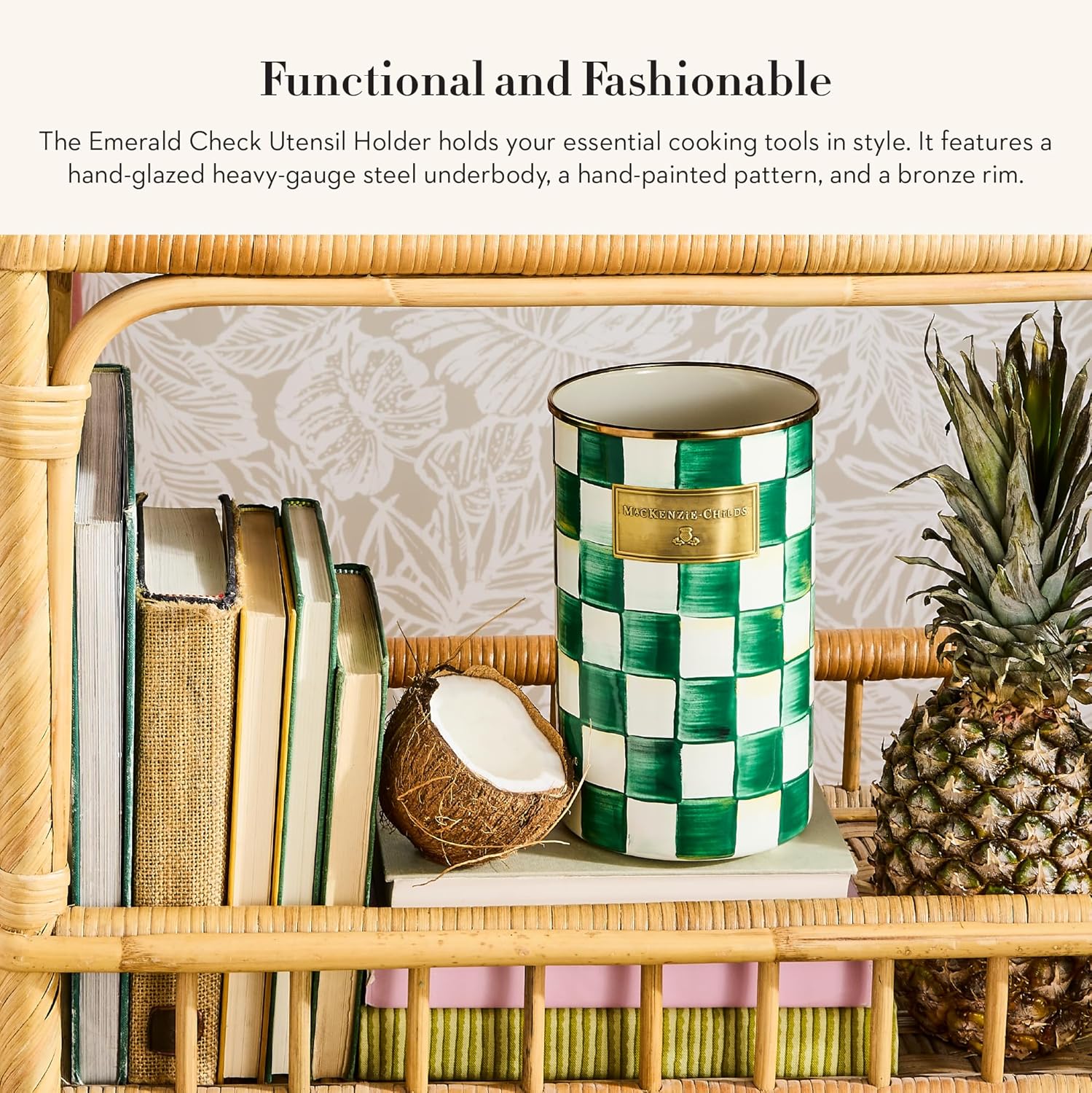 MACKENZIE-CHILDS Enamel Utensil Holder, Kitchen Utensil Holder for Countertop, Green-and-White Emerald Check