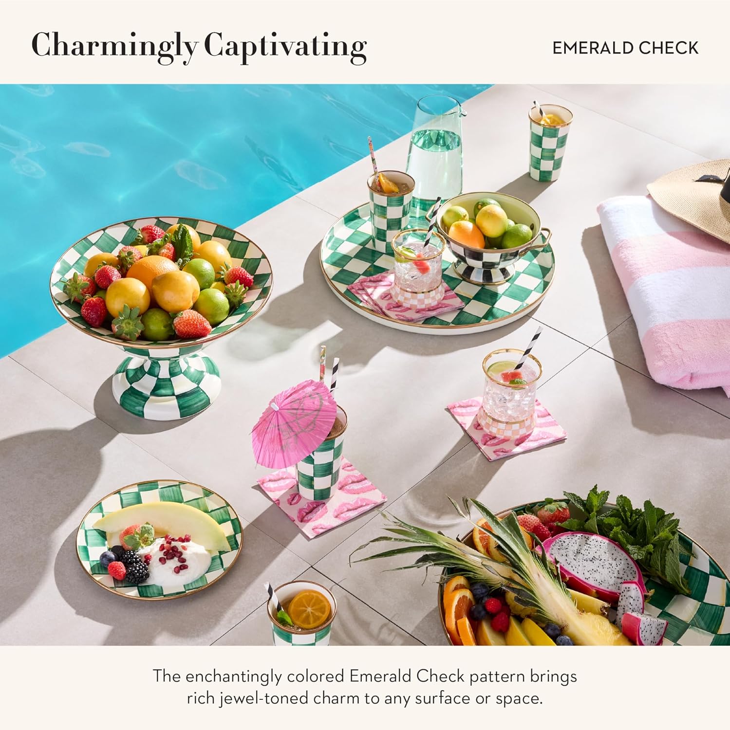 - ELEGANT SERVING ESSENTIAL: The Emerald Check round decorative tray features a sturdy steel base and an enchanting jewel-toned palette woven by an artisan’s brush through glossy hand-painted green-and-white checks.
