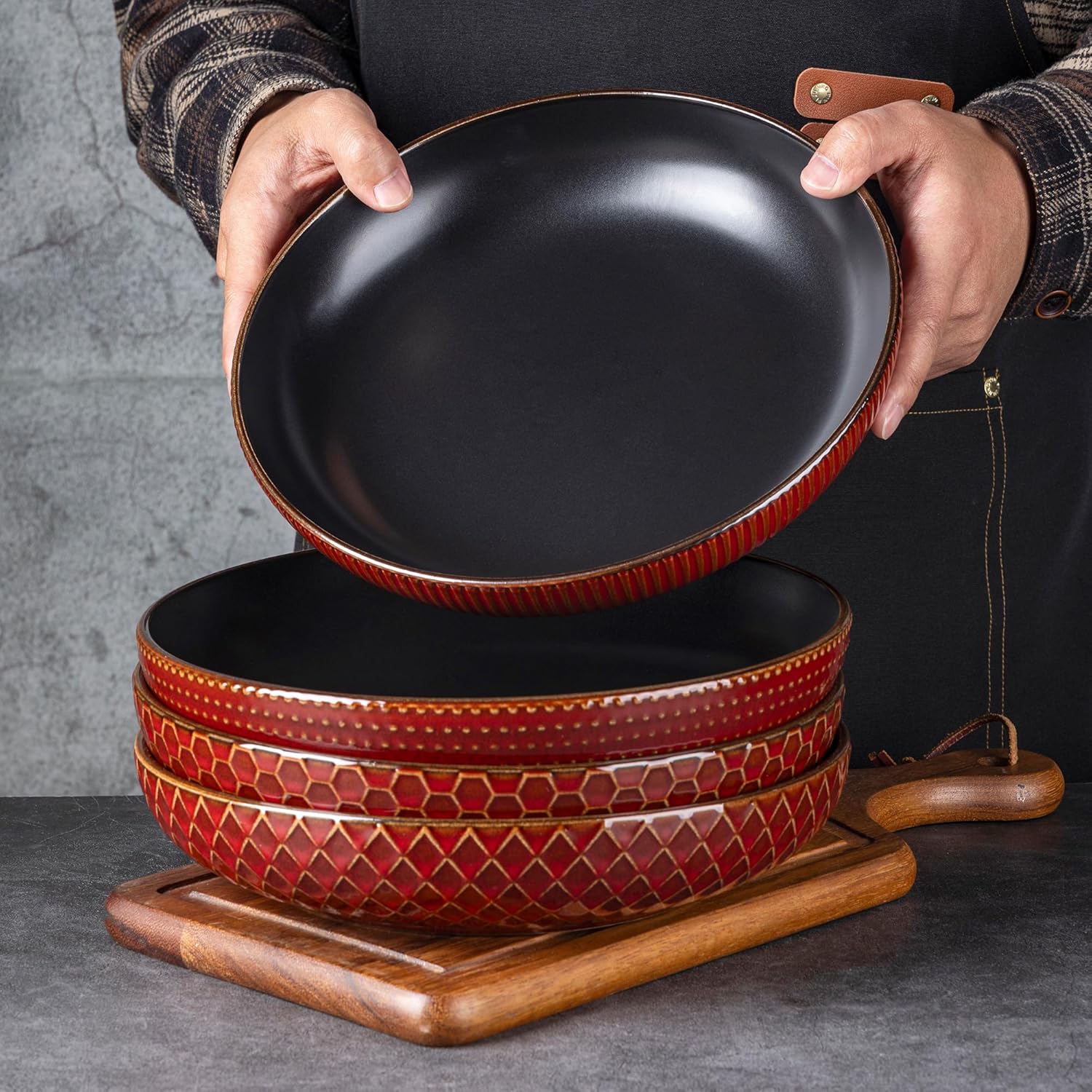GBHOME 9.5'' Large Pasta Bowls, 42 Ounce Stoneware Salad Bowls for Kitchen, Ceramic Serving Bowls With Textured Pattern for Pasta,Fruit, Stews,Noodle, House-warming Gift, Set of 4-Rythmic Red