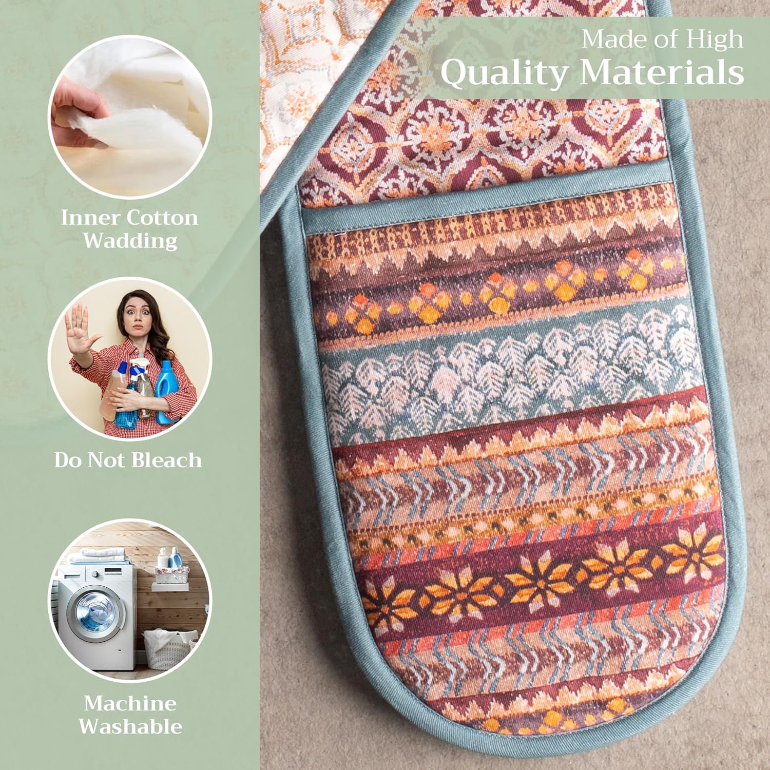 - 100% QUILTED COTTON - Unlike other double oven mitts, we only use the best quality cotton to ensure that only the finest gloves produced end up on your hands