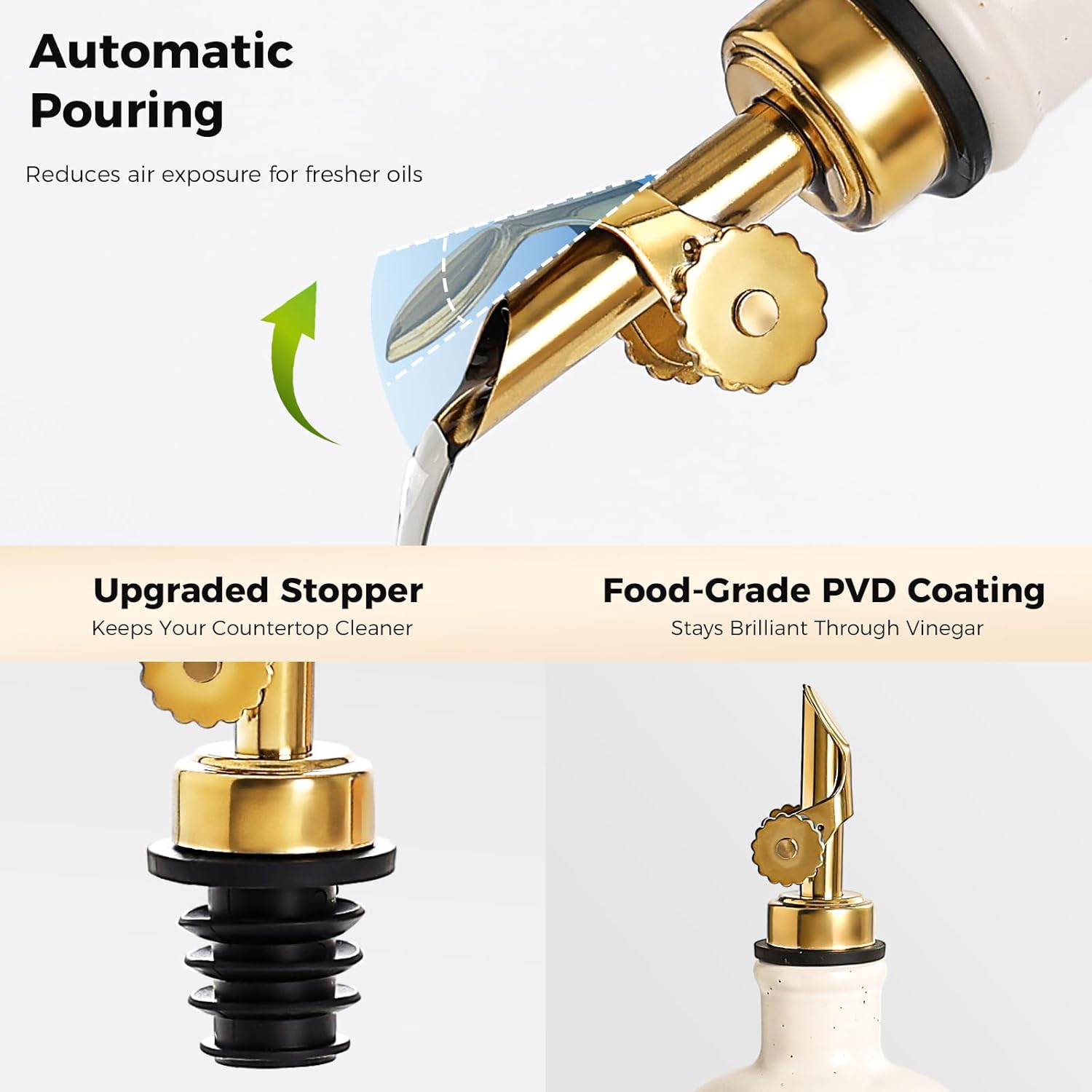 - NON-DRIP DESIGN: Our gold spout is equipped with an upgraded tightened rubber ring, keeping your countertop and bottle clean by preventing drips and spills. This can make your cooking experience more enjoyable and less messy